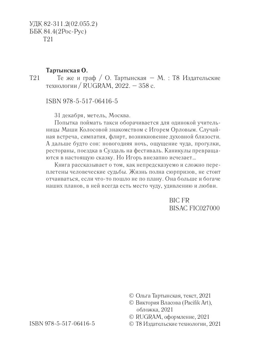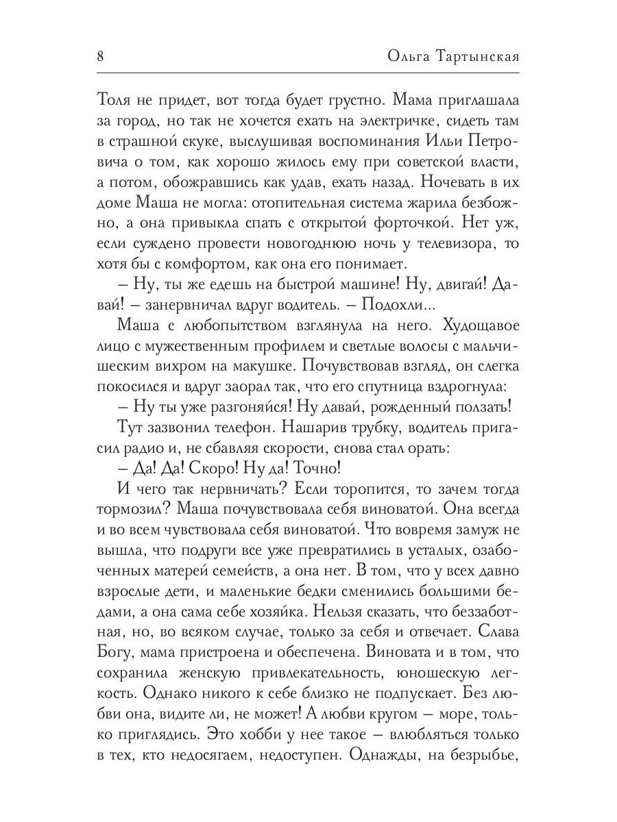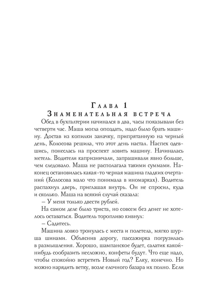 31 декабря, метель, Москва. Попытка поймать такси оборачивается для одинокой учительницы Маши Колосовой знакомством с Игорем Орловым. Случайная встреча, симпатия, флирт, возникновение духовной близости. А дальше будто сон: новогодняя ночь, ощущение чуда, прогулки, рестораны, поездка в Суздаль на фестиваль. Каникулы превращаются в настоящую сказку. Но Игорь внезапно исчезает… Книга рассказывает о том, как непредсказуемо и сложно переплетены человеческие судьбы. Жизнь полна сюрпризов, не стоит отчаиваться, если что-то пошло не по плану. Она больше и богаче наших планов, в ней всегда есть место чуду, удивлению и любви.| Издательство | Т8 RUGRAM |