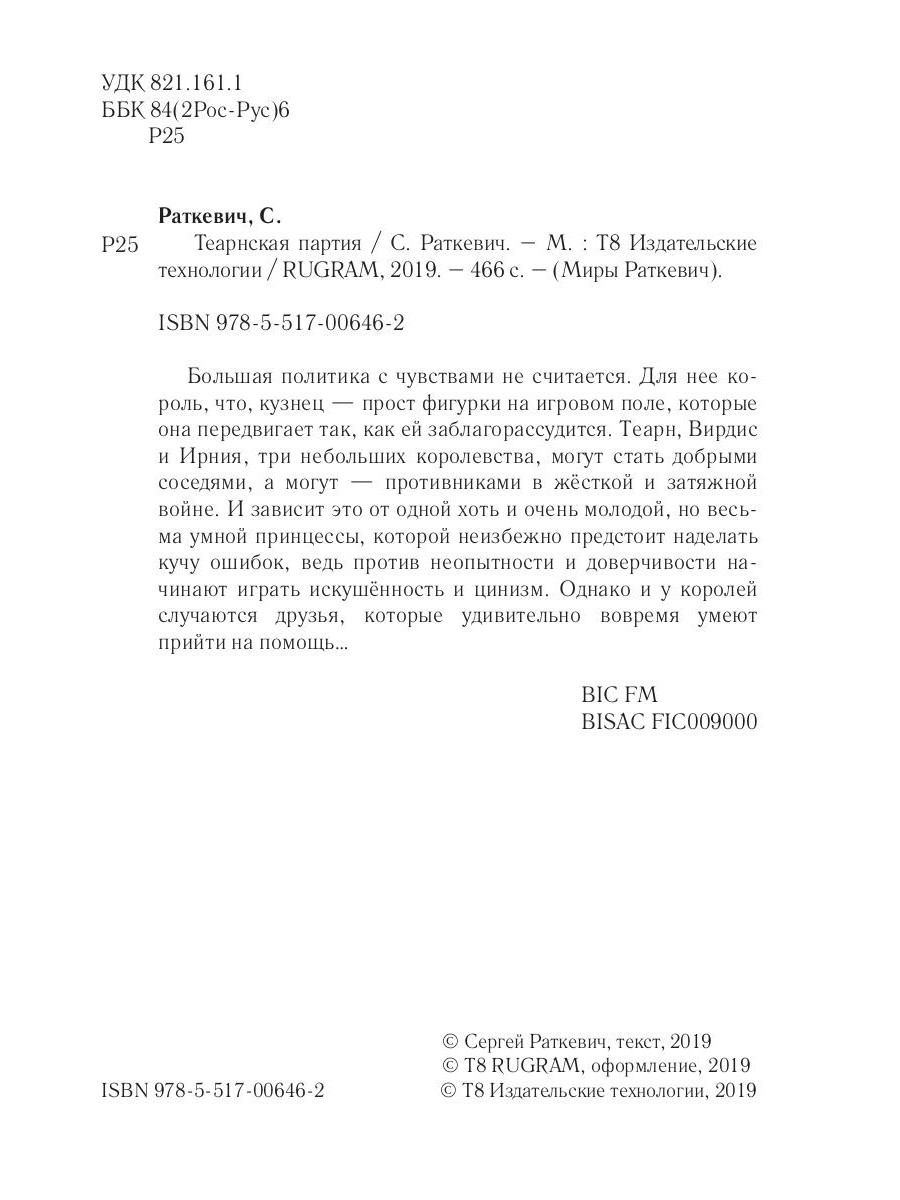 Большая политика с чувствами не считается. Для нее король, что, кузнец - прост фигурки на игровом поле, которые она передвигает так, как ей заблагорассудится. Теарн, Вирдис и Ирния, три небольших королевства, могут стать добрыми соседями, а могут - противниками в жёсткой и затяжной войне. И зависит это от одной хоть и очень молодой, но весьма умной принцессы, которой неизбежно предстоит наделать кучу ошибок, ведь против неопытности и доверчивости начинают играть искушённость и цинизм. Однако и у королей случаются друзья, которые удивительно вовремя умеют прийти на помощь...| Издательство | Т8 RUGRAM |