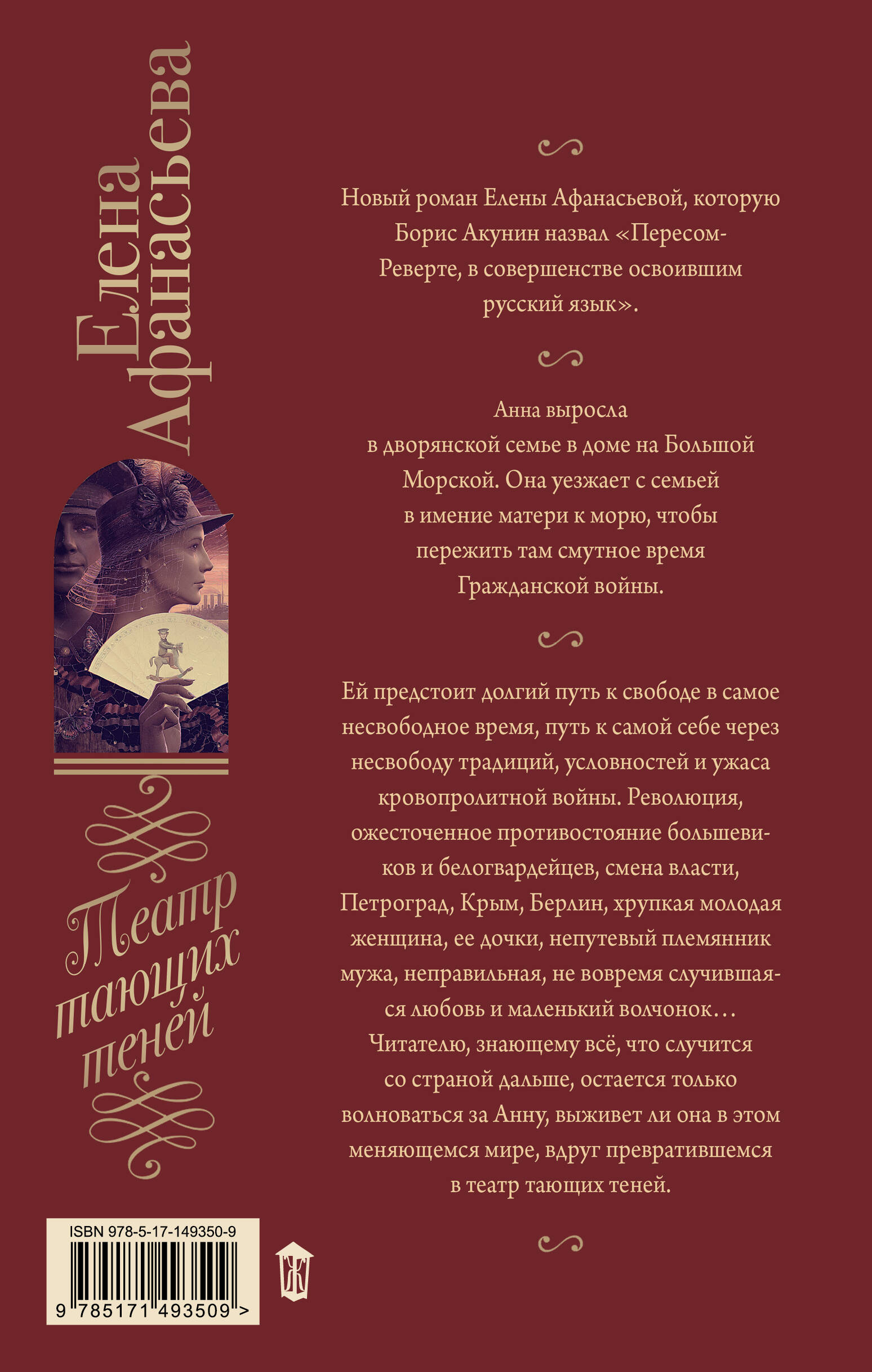 Анна выросла в дворянской семье в доме на Большой Морской. Она уезжает с семьей в имение матери к морю, чтобы пережить там смутное время Гражданской войны. Ей предстоит долгий путь к свободе в самое несвободное время, путь к самой себе через несвободу традиций, условностей и ужаса кровопролитной войны. Революция, ожесточенное противостояние большевиков и белогвардейцев, смена власти, Петроград, Крым, Берлин, хрупкая молодая женщина, ее дочки, непутевый племянник мужа, неправильная, не вовремя случившаяся любовь и маленький волчонок… Читателю, знающему всё, что случится со страной дальше, остается только волноваться за Анну, выживет ли она в этом меняющемся мире, вдруг превратившимся в театр тающих теней. Новый роман Елены Афанасьевой, которую Борис Акунин назвал "Пересом-Реверте, в совершенстве освоившим русский язык".| Издательство | ИЗДАТЕЛЬСТВО "АСТ" |