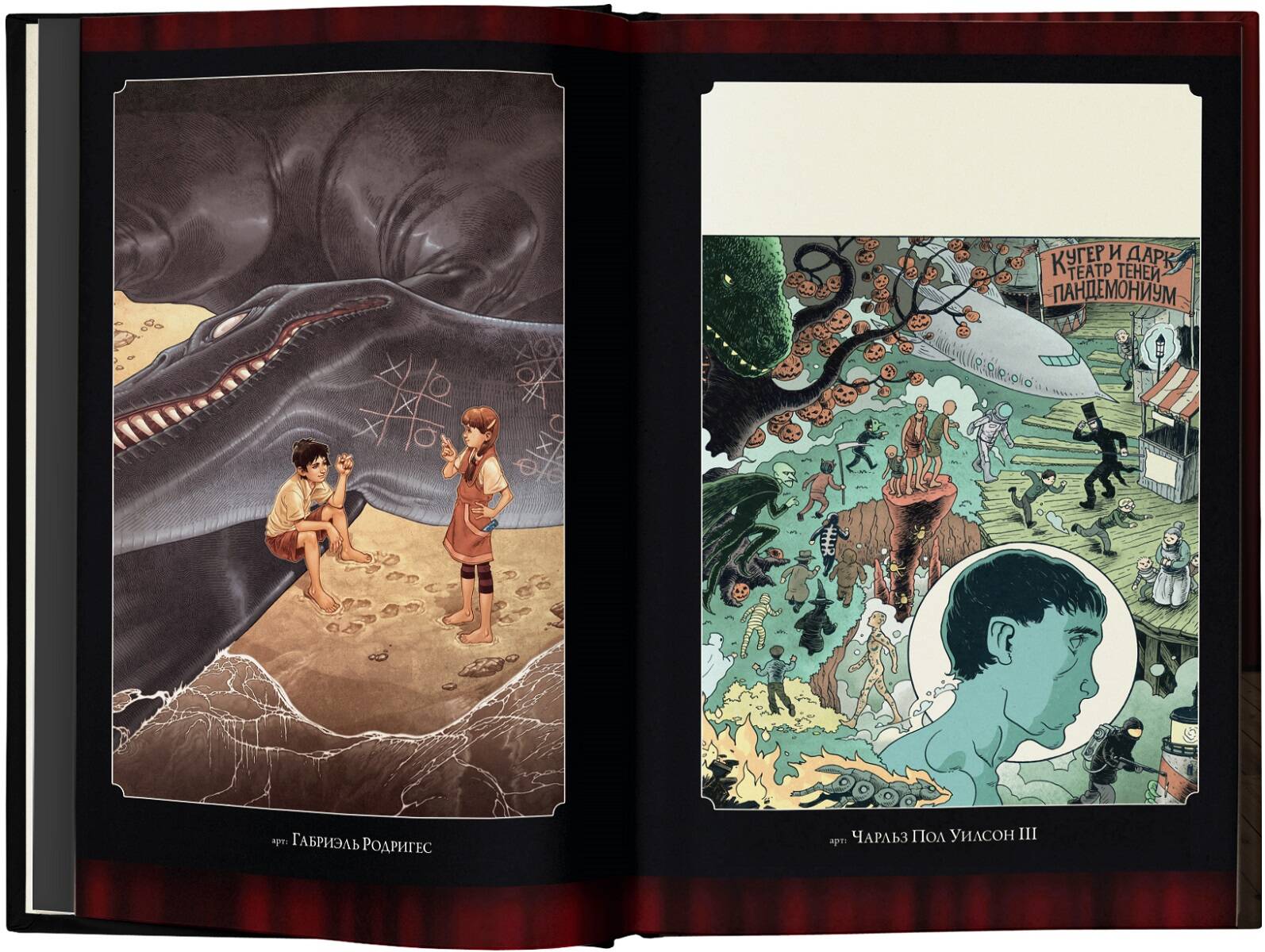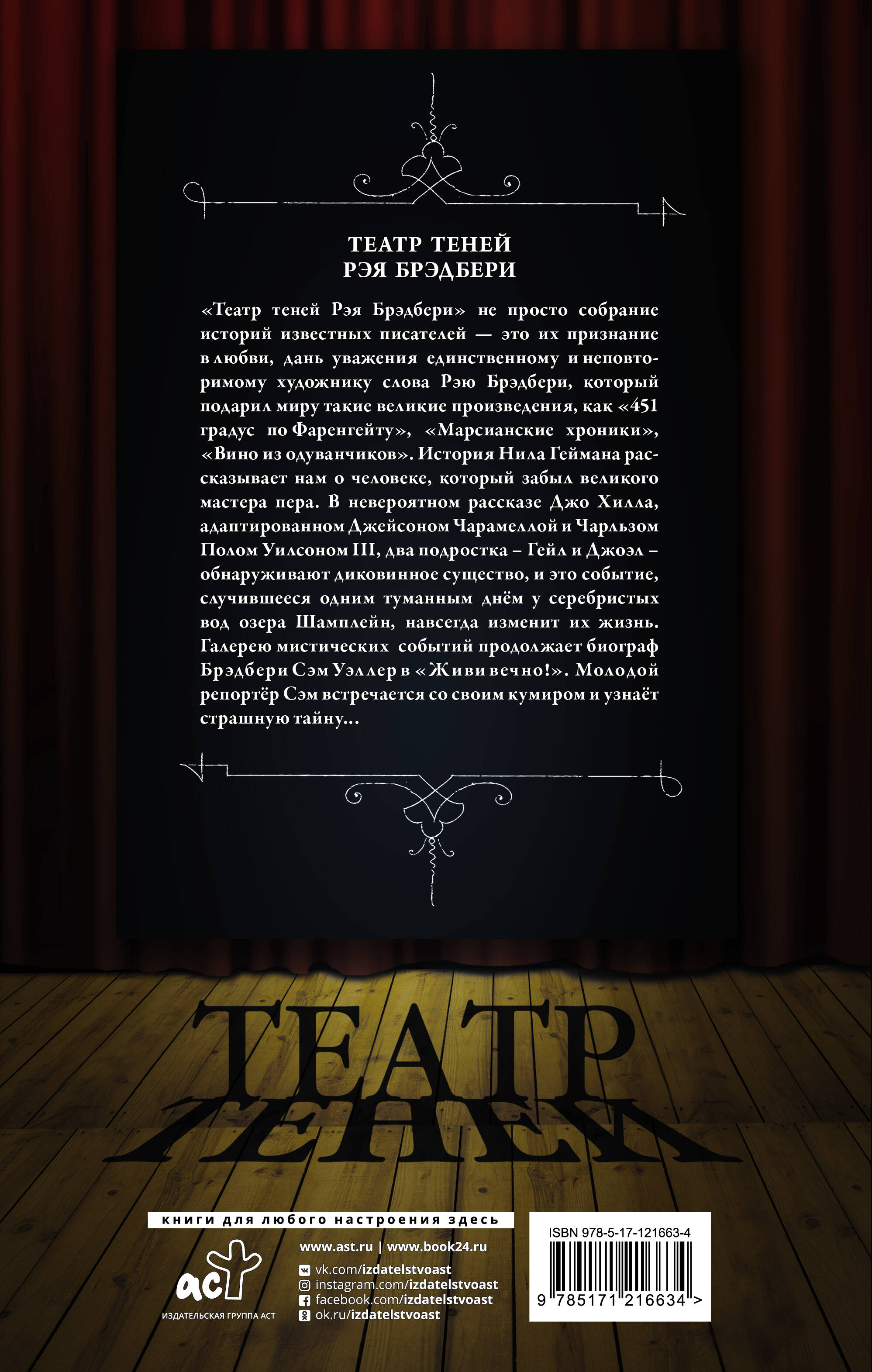 "Театр Теней Рэя Брэдбери" не просто собрание историй известных писателей - это их признание в любви, дань уважения единственному и неповторимому художнику слова Рэю Брэдбери, который подарил миру такие великие произведения, как "451 градус по Фаренгейту", "Марсианские хроники", "Вино из одуванчиков". История Нила Геймана рассказывает нам о человеке, который забыл великого мастера пера. В невероятном рассказе Джо Хилла, адаптированном Джейсоном Чарамеллой и Чарльзом Полом Уилсоном III, два подростка - Гейл и Джоэл - обнаруживают диковинное существо, и это событие, случившееся одним туманным днём у серебристых вод озера Шамплейн, навсегда изменит их жизнь. Галерею мистических событий продолжает биограф Брэдбери Сэм Уэллер в "Живи вечно!". Молодой репортёр Сэм встречается со своим кумиром и узнаёт страшную тайну…| Издательство | ИЗДАТЕЛЬСТВО "АСТ" |