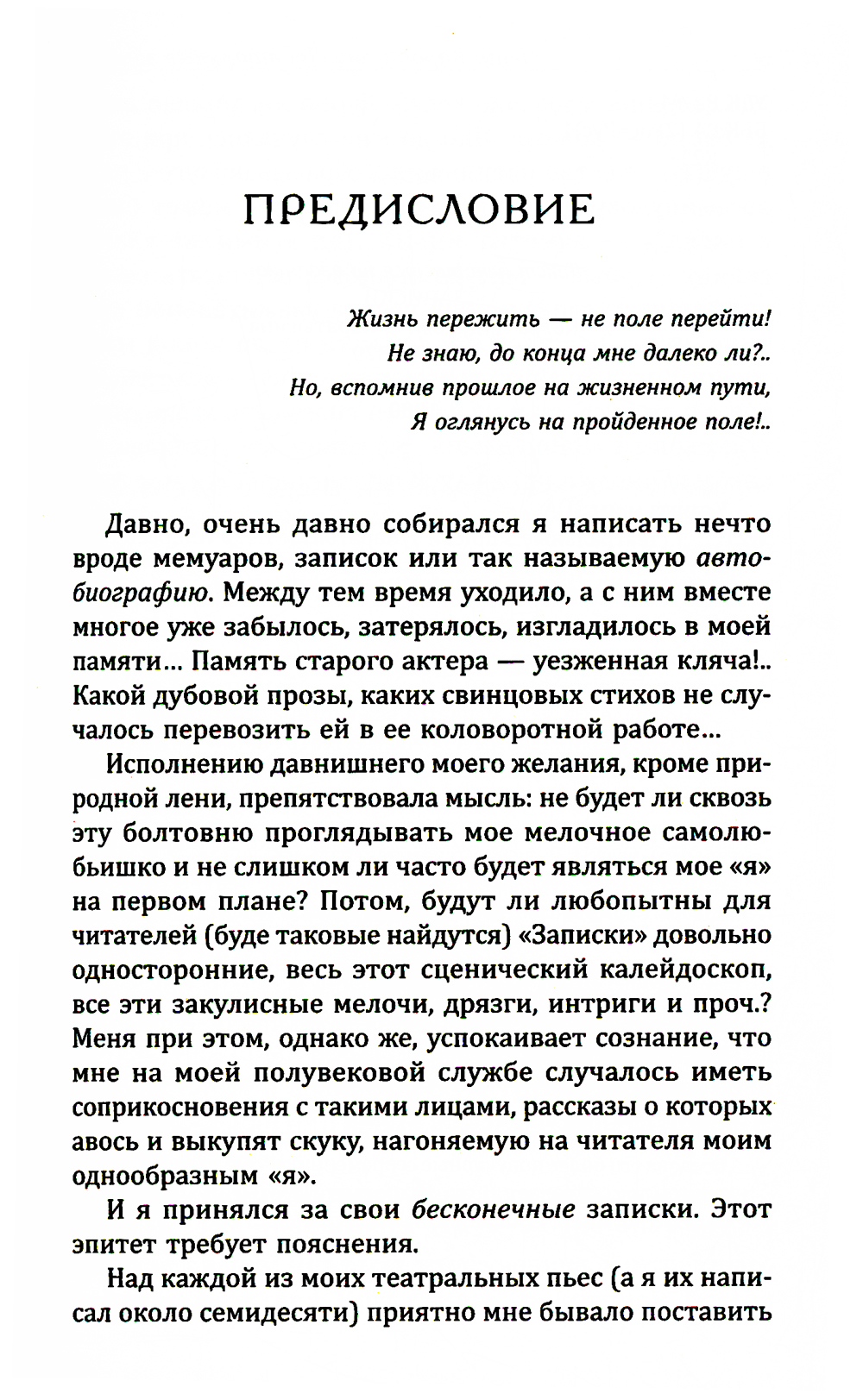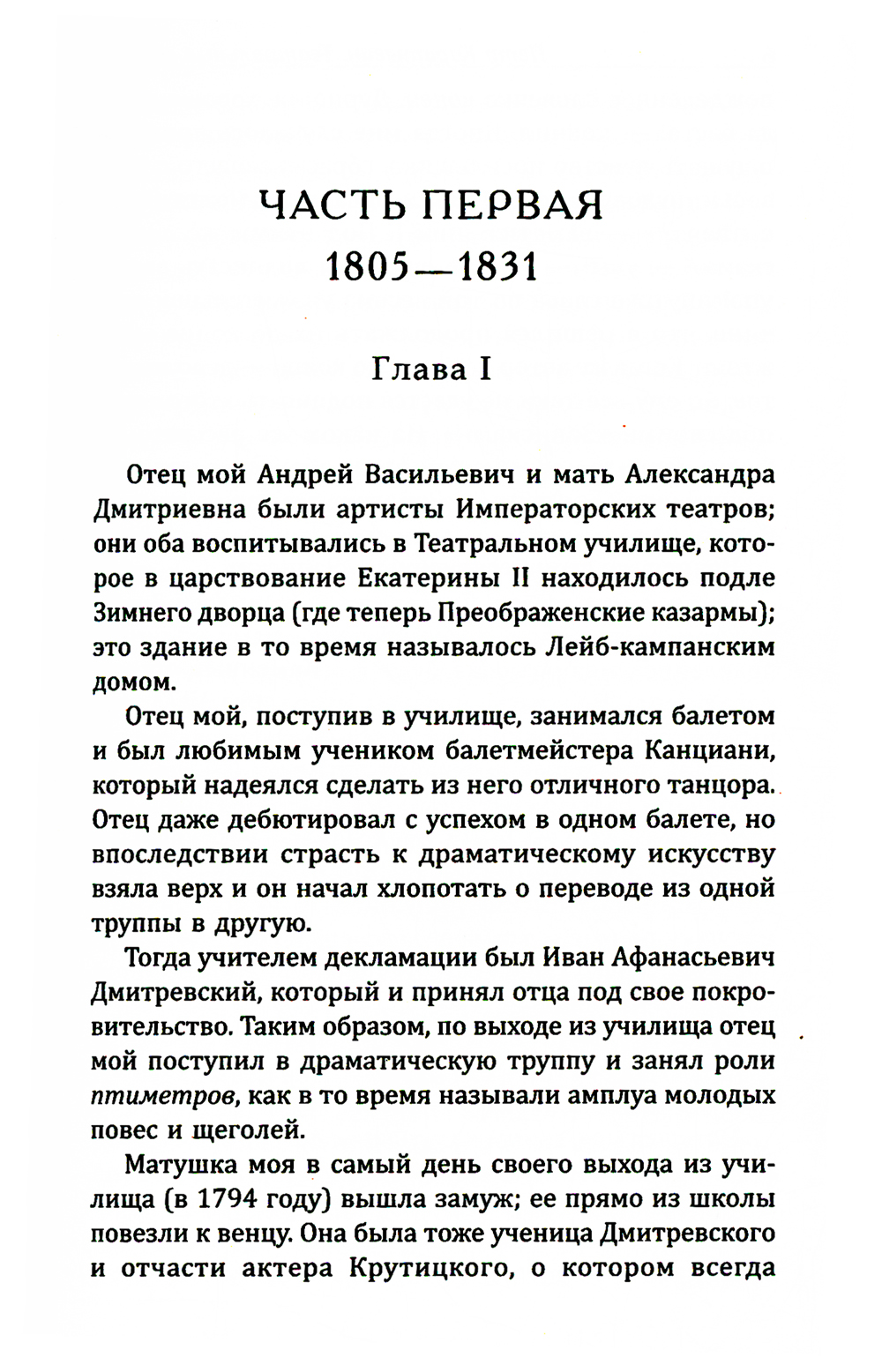 Петр Андреевич Каратыгин (1805-1879) - потомственный актер, драматург, педагог, мемуарист - вспоминает молодость - свою и русского театра. В начале XIX века меняется вся картина театральной жизни в России: увеличивается количество театральных трупп, расширяется состав актеров. Специально для сцены знаменитые авторы пишут, переводят и адаптируют произведения самых разных жанров. Сцена начинает остро нуждаться в профессионалах, и их воспитывают в Петербургском театральном училище. В Москве и Петербурге открываются Императорские театры, в труппы которых приглашают наиболее способных и талантливых выпускников училища. Императорские театры, несмотря на свое пышное название, мало отличались от нынешних театров в плане взаимоотношений актеров между собой: кипели те же страсти, устраивались розыгрыши, плелись интриги. Перед вами своего рода энциклопедия целой театральной эпохи. Как Крылов воспринимал «экранизации» своих басен? Откуда взялось выражение «игра не стоит свеч»? Любили ли Грибоедова его более популярные современники?.. Об этом и о многом другом рассказывает Петр Андреевич Каратыгин с присущими ему остроумием, иронией и наблюдательностью.| Издательство | Захаров** |