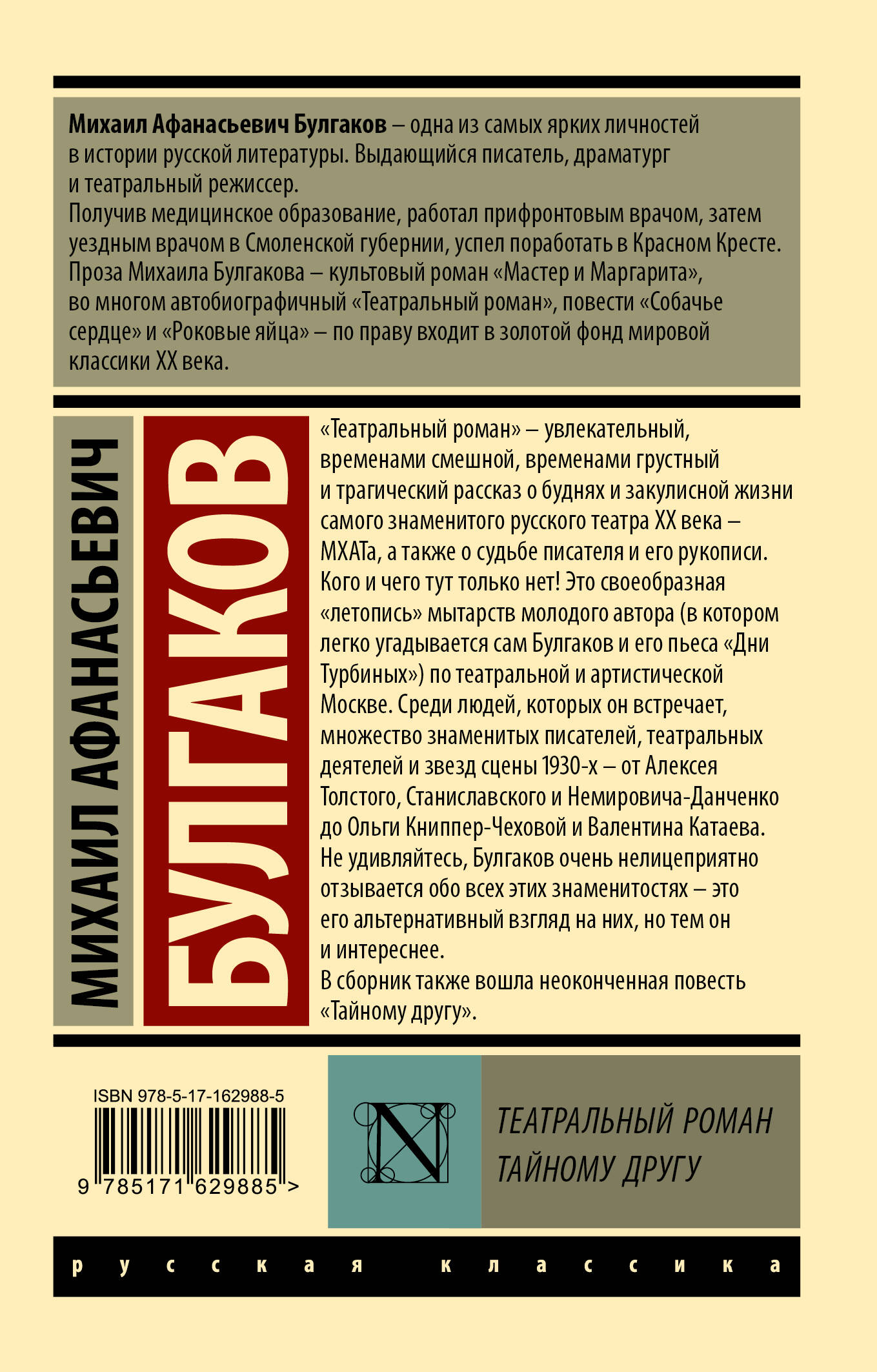 "Театральный роман" - увлекательный, временами смешной, временами грустный и трагический рассказ о буднях и закулисной жизни самого знаменитого русского театра ХХ века - МХАТа, а также о судьбе писателя и его рукописи. Кого и чего тут только нет! Это своеобразная летопись "мытарств" молодого автора (в котором легко угадывается сам Булгаков и его пьеса "Дни Турбиных") по театральной и артистической Москве. Среди людей, которых он встречает, множество знаменитых писателей, театральных деятелей и звезд сцены 1930-х - от Алексея Толстого, Станиславского и Немировича-Данченко до Ольги Книппер-Чеховой и Валентина Катаева. Не удивляйтесь, Булгаков очень нелицеприятно отзывается обо всех этих знаменитостях - это его альтернативный взгляд на них, но тем он и интереснее. В сборник также вошла неоконченная повесть "Тайному другу".| Издательство | Издательство "АСТ" |