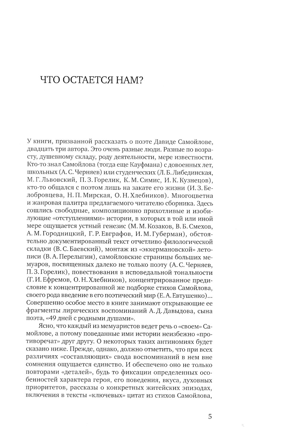 В книге впервые собраны воспоминания о Давиде Самойлове (1920-1990), одном из крупнейших русских поэтов второй половины XX века. Кроме того, он был и одной из наиболее ярких личностей своего времени, связанный судьбой с многими своими выдающимися современниками. Однако в сборник включены не только мемуары знаменитостей, а и просто близких ему людей - друзей, учеников. Собранные воедино, они создают объемный образ этого большого поэта. Это будет отнюдь не скучное чтение, учитывая блестящее остроумие Самойлова. Большинство авторов приводит его многочисленные меткие шутки, эпиграммы, юмористические послания в стихах. Нет сомнения, что книга заинтересует широкого читателя.| Издательство | Центр книги Рудомино |