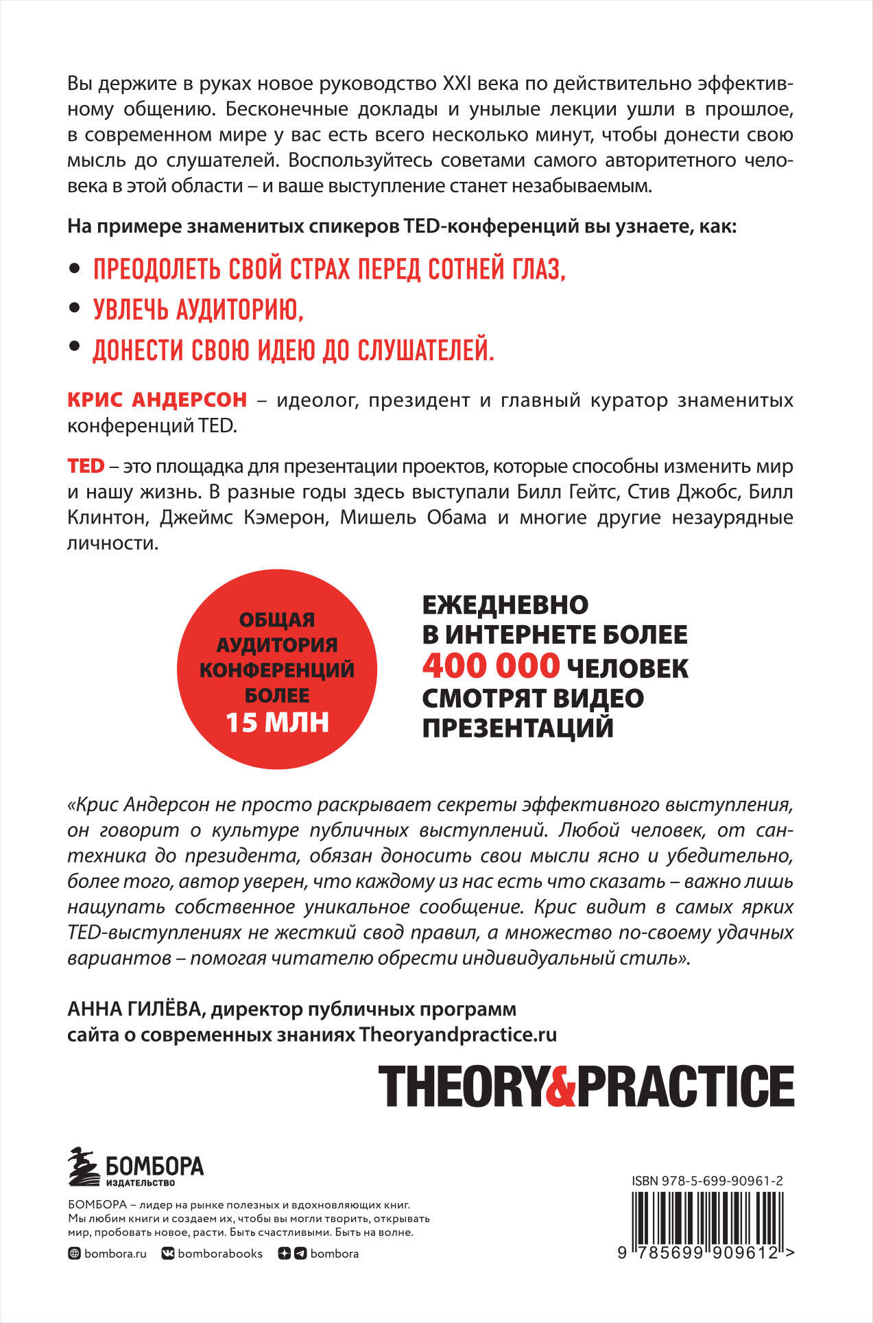 Об авторе Крис Андерсон - идеолог, президент и главный куратор знаменитых конференций TED. Человек, который сформулировал основные принципы успешного выступления. Он окончил Оксфордский университет, работал журналистом, создал более сотни журналов и интернет-сайтов. В 2001 году некоммерческая организация Криса приобрела проект ТED и сделала его одним из самых успешных за последние десятилетия. Он работал со всеми ораторами TED, которые по-настоящему вдохновили своих слушателей. Что такое TED ТЕD - это площадка для презентации проектов, которые способны изменить мир и нашу жизнь. Девиз TED - «Идеи заслуживают распространения». В разные годы здесь выступали Билл Гейтс, Стив Джобс, Билл Клинтон, Джеймс Кэмерон, Мишель Обама и многие другие незаурядные личности. Ежедневно в Интернете более 400 000 человек смотрят видео презентаций. Общая аудитория конференций - более 15 млн. О чем Это руководство по составлению незабываемых выступлений от настоящего инсайдера. С начала работы в TED Крис Андерсон показывал, как тщательно продуманная короткая речь может пробудить сочувствие, вызвать интерес, передать знания и сделать мечту одного человека общей для многих. Правильно построенная презентация может воодушевить зал и изменить мировоззрение слушателей во всем мире. По словам самого автора: «Цель этой книги - объяснить чудо эффективного публичного выступления и дать вам инструменты, которые позволят совершить это чудо». Для кого Для всех, кто сталкивается с необходимостью проводить презентации и участвовать в публичных выступлениях. Для бизнесменов. Для политиков. Отзывы «Это не просто самая содержательная книга, когда-либо написанная о публичных выступлениях. Это блестящий, глубокий анализ искусства общения. Если вы когда-нибудь соберетесь выйти к публике - эта книга обязательна к прочтению. Она дает мне надежду на то, что слова всё же смогут изменить мир». - Адам Грант, профессор Уортонского университета, автор книг «Брать и давать» и «Оригиналы» «Никто в мире не понимает науку и искусство публичных выступлений лучше Криса Андерсона. За многие годы он воспитал, обучил и поддержал огромное множество ораторов (в том числе, и меня). Он помог нам выступить на сцене наилучшим образом, - а ведь в те моменты мы страшно нервничали и с трудом справлялись с собой. Нельзя представить лучшего автора для подобной книги. Она станет прекрасным подарком для многих людей». - Элизабет Гилберт, автор книг «Ешь, молись, люби» и «Происхождение всех вещей» «Программа TED открыла искусство риторики для XXI века. Прощайте академическая рассеянность, научная тарабарщина, напыщенное морализаторство, усыпляющие презентации PowerPoint - теперь мы знаем, что "идеи, заслуживающие распространения", действительно можно широко представить и сделать это в доступной и увлекательной форме. Эта книга может вернуть риторике заслуженное место - ведь это действительно один из важнейших навыков любого образованного человека». - Стивен Пинкер, профессор Гарвардского университета, автор книг «Как работает разум» и «Чувство стиля»| Издательство | ООО "Издательство "Эксмо" |