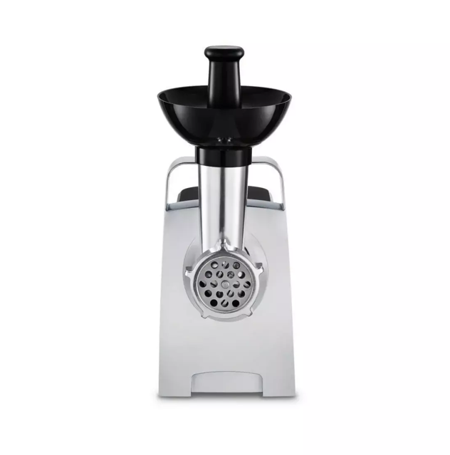 Мощная мясорубка до 1,7 кг/мин. Изготовлена из нержавеющей стали и пластика. В комплекте разные решетки, терки и насадка для колбас. Есть реверс и автоотключение.