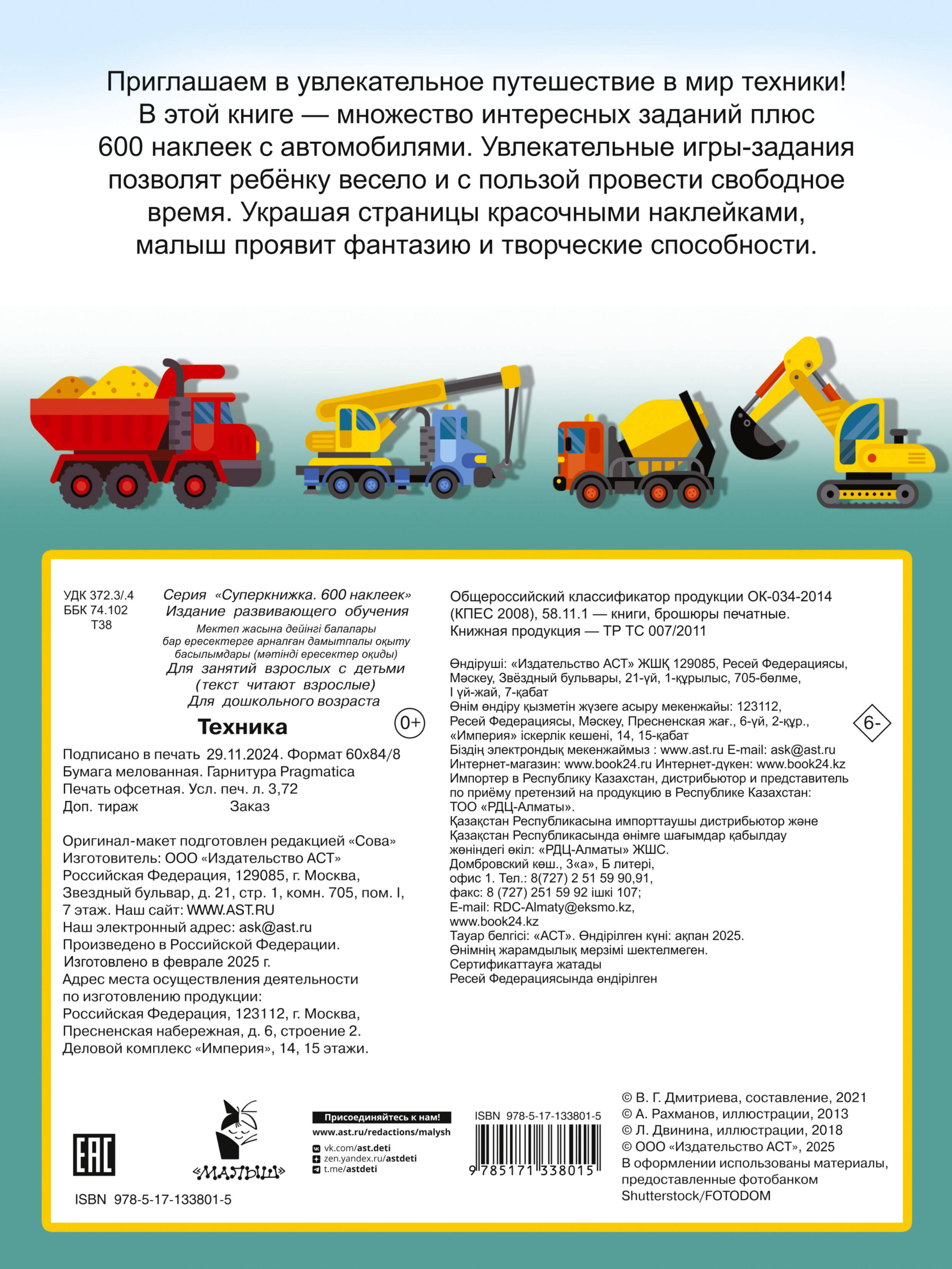 Развивающая книжка «Техника» позволит вашему ребёнку с головой окунуться в удивительный мир автомобилей. В ней ребёнок найдёт более 600 красочных наклеек с машинами всех цветов и размеров, от манёвренных спортивных купе до мощных внедорожников. Каждая страница книги - это игровое поле, на котором нужно разместить подходящие наклейки. Игра со стикерами способствует развитию мелкой моторики и позволяет ребёнку проявить творческие способности. Книжка с наклейками для детей дошкольного возраста. • Более 600 красочных наклеек с автомобилями. • Отличный способ потренировать наблюдательность и внимание. • Игра со стикерами надолго займёт малыша. • Каждая страница - яркое игровое поле. • Отличный тренажёр для развития мелкой моторики| Издательство | ИЗДАТЕЛЬСТВО "АСТ" |