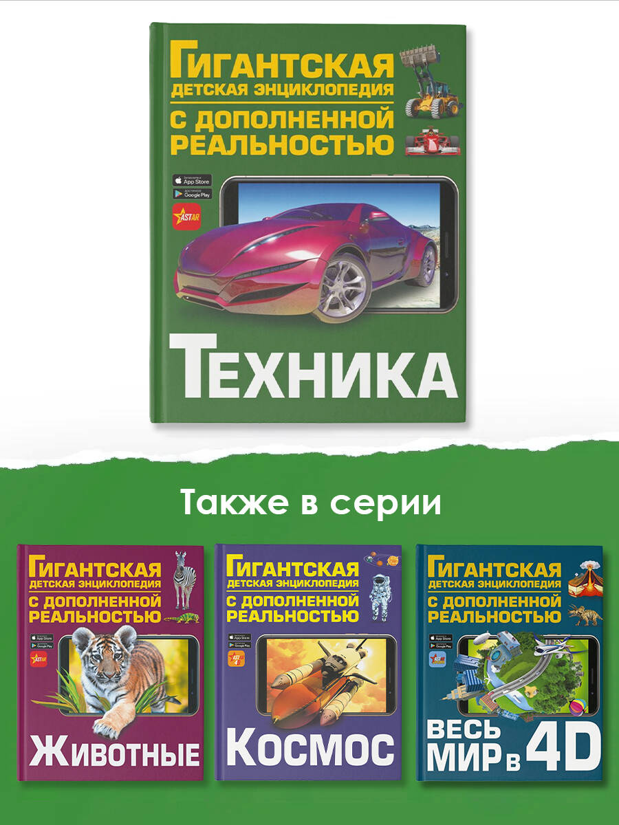 Вы наверняка интересуетесь техникой. И правильно, ведь людям без нее не обойтись. На общественном транспорте мы ездим в школу, в гости к друзьям, в маггазины, а чтобы преодолеть дальние расстояния, пересаживаемся на поезда, самолеты или корабли. С помощью дорожно-строительной техники вырастают города и проходят дороги там, где раньше росли необходимые леса. А с помощью космической техники человек покоряет космос. Есть и еще один вид техники - боевой. Она стоит на страже мира и порядка. Полистайте страницы нашей гигантской энциклопедии, и вы познакомитесь поближе с разными видами техники. Причем сможете не только увидеть все это на наших красочных иллюстрациях и прочесть описания, но и детально рассмотреть в объеме и движении. Разобраться, как работает нефтедобывающая платформа, увидеть своими глазами, как произошло крушение "Титаника", запустить ракету в космос, управлять танком и самолетом - это и многое другое станет доступно вам с нашей гигантской 3D-энциклопедией с дополненной реальностью. И всем этим будете управлять вы сами. Как такое возможно? Откройти заинтересовавшую вас страницу энциклопедии, отмеченную специальным значком, направьте на нее смартфон или планшет с установленным бесплатным приложением ASTAR - и перед вами развернутся небывалые возможности дополненной реальности. Наша уникальная детская энциклопедия не только поделится с вами новыми знаниями, но и доставит немало захватывающих дух переживаний. Для среднего и старшего школьного возраста.| Издательство | ИЗДАТЕЛЬСТВО "АСТ" |
