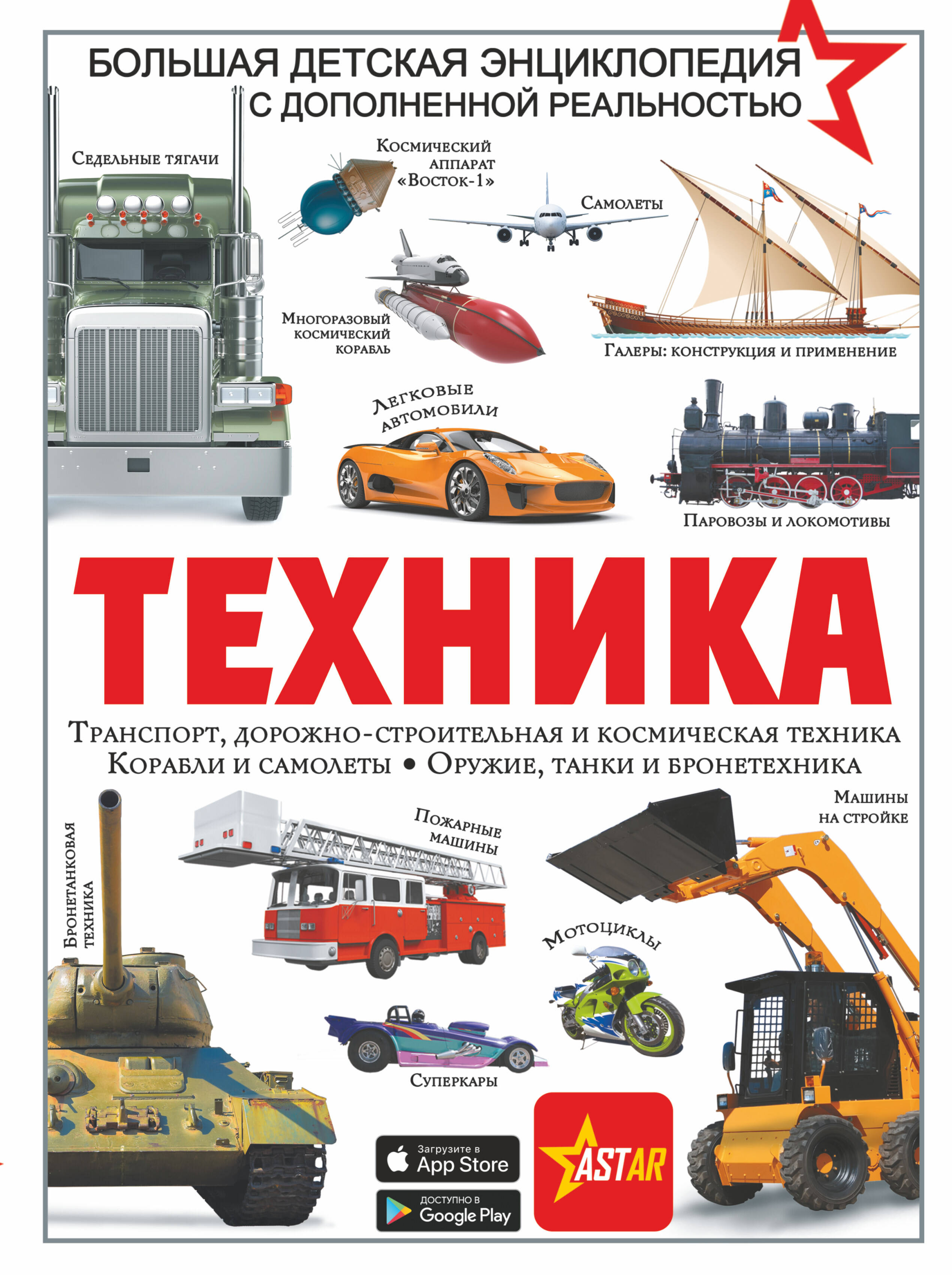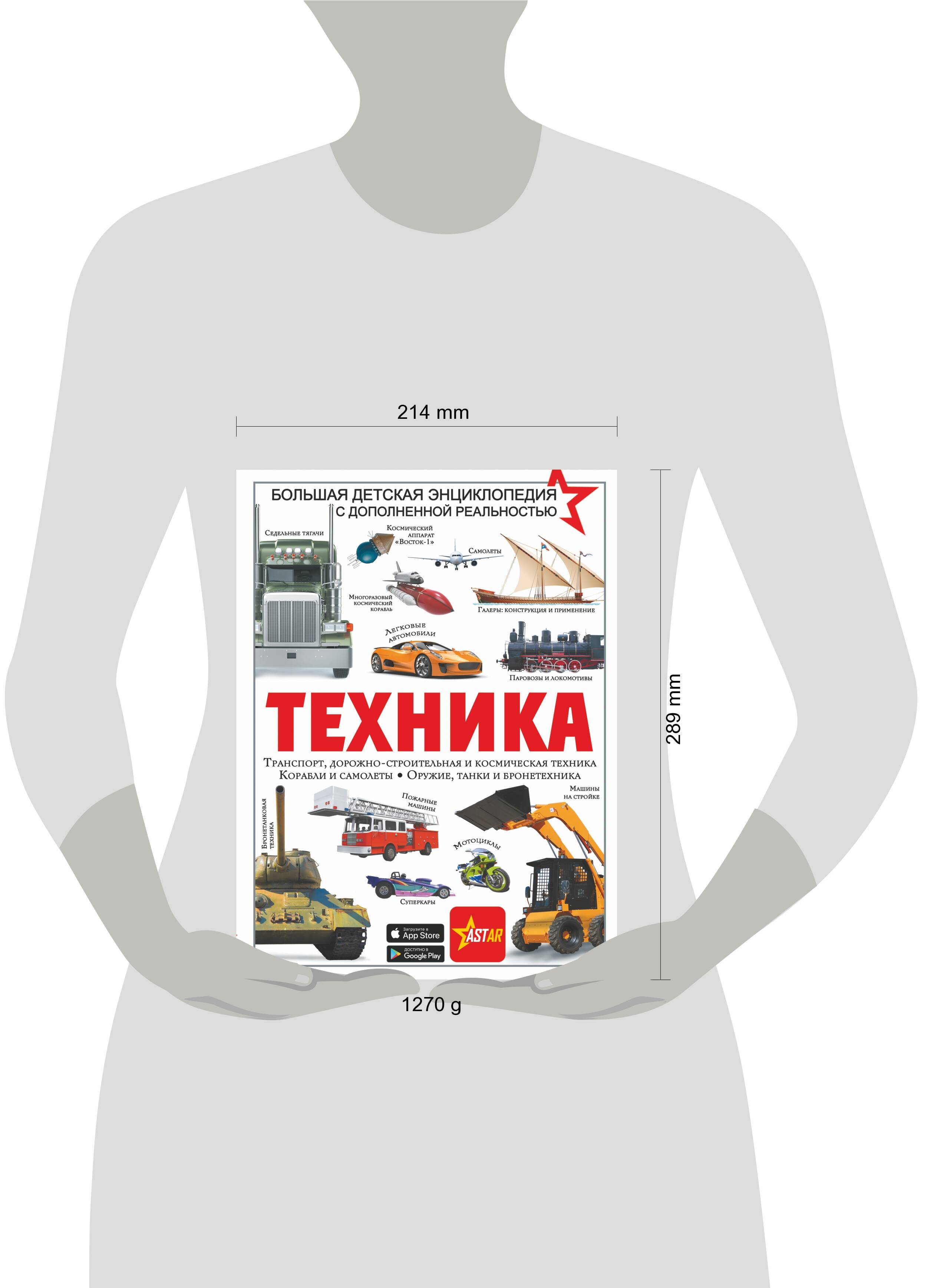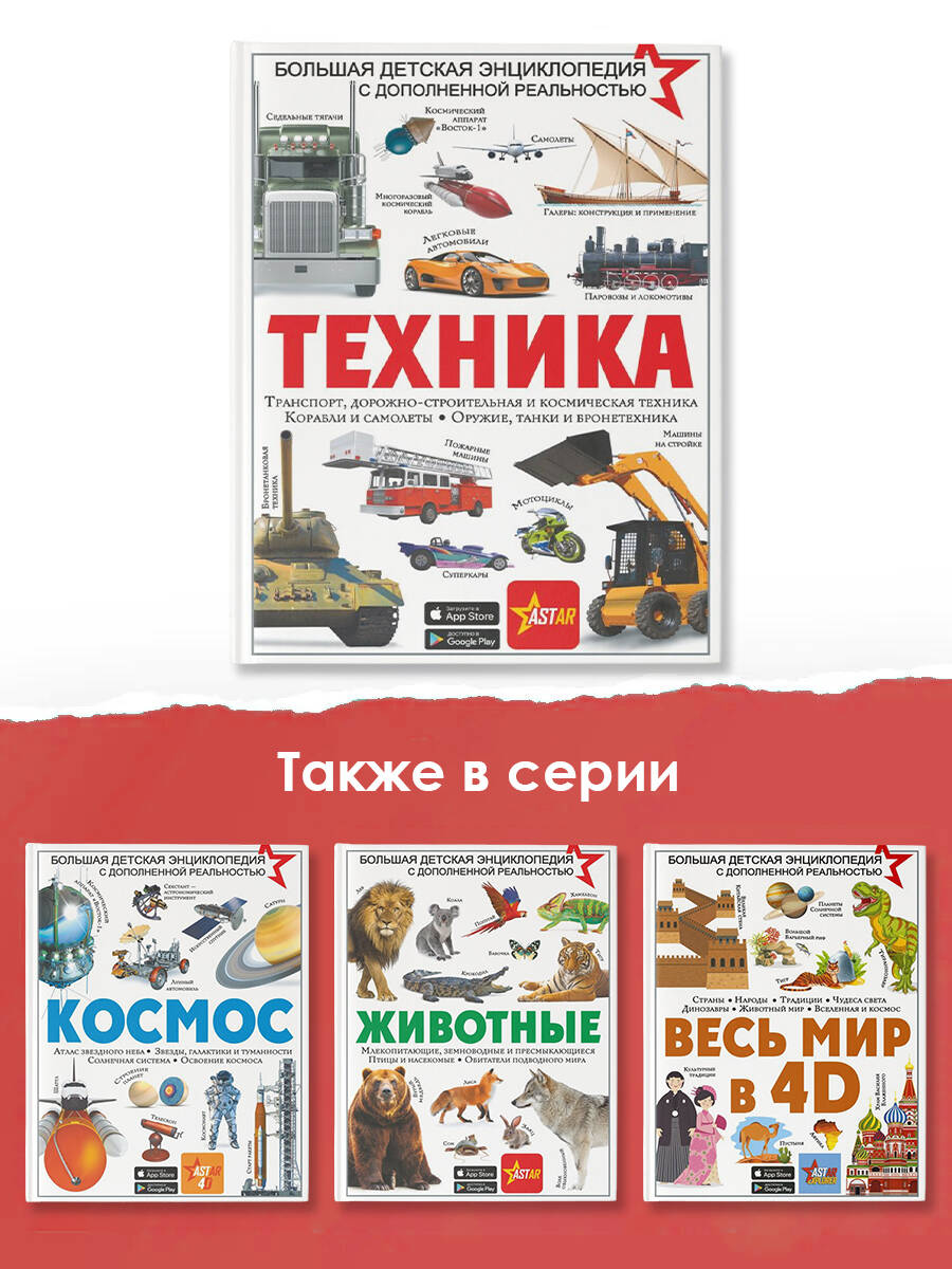 Вы наверняка интересуетесь техникой. И правильно, ведь людям без нее не обойтись. На общественном транспорте мы ездим в школу, в гости к друзьям, в маггазины, а чтобы преодолеть дальние расстояния, пересаживаемся на поезда, самолеты или корабли. С помощью дорожно-строительной техники вырастают города и проходят дороги там, где раньше росли необходимые леса. А с помощью космической техники человек покоряет космос. Есть и еще один вид техники - боевой. Она стоит на страже мира и порядка. Полистайте страницы нашей гигантской энциклопедии, и вы познакомитесь поближе с разными видами техники. Причем сможете не только увидеть все это на наших красочных иллюстрациях и прочесть описания, но и детально рассмотреть в объеме и движении. Разобраться, как работает нефтедобывающая платформа, увидеть своими глазами, как произошло крушение "Титаника", запустить ракету в космос, управлять танком и самолетом - это и многое другое станет доступно вам с нашей гигантской 3D-энциклопедией с дополненной реальностью. И всем этим будете управлять вы сами. Как такое возможно? Откройти заинтересовавшую вас страницу энциклопедии, отмеченную специальным значком, направьте на нее смартфон или планшет с установленным бесплатным приложением ASTAR - и перед вами развернутся небывалые возможности дополненной реальности. Наша уникальная детская энциклопедия не только поделится с вами новыми знаниями, но и доставит немало захватывающих дух переживаний. Для среднего и старшего школьного возраста.| Издательство | ИЗДАТЕЛЬСТВО "АСТ" |