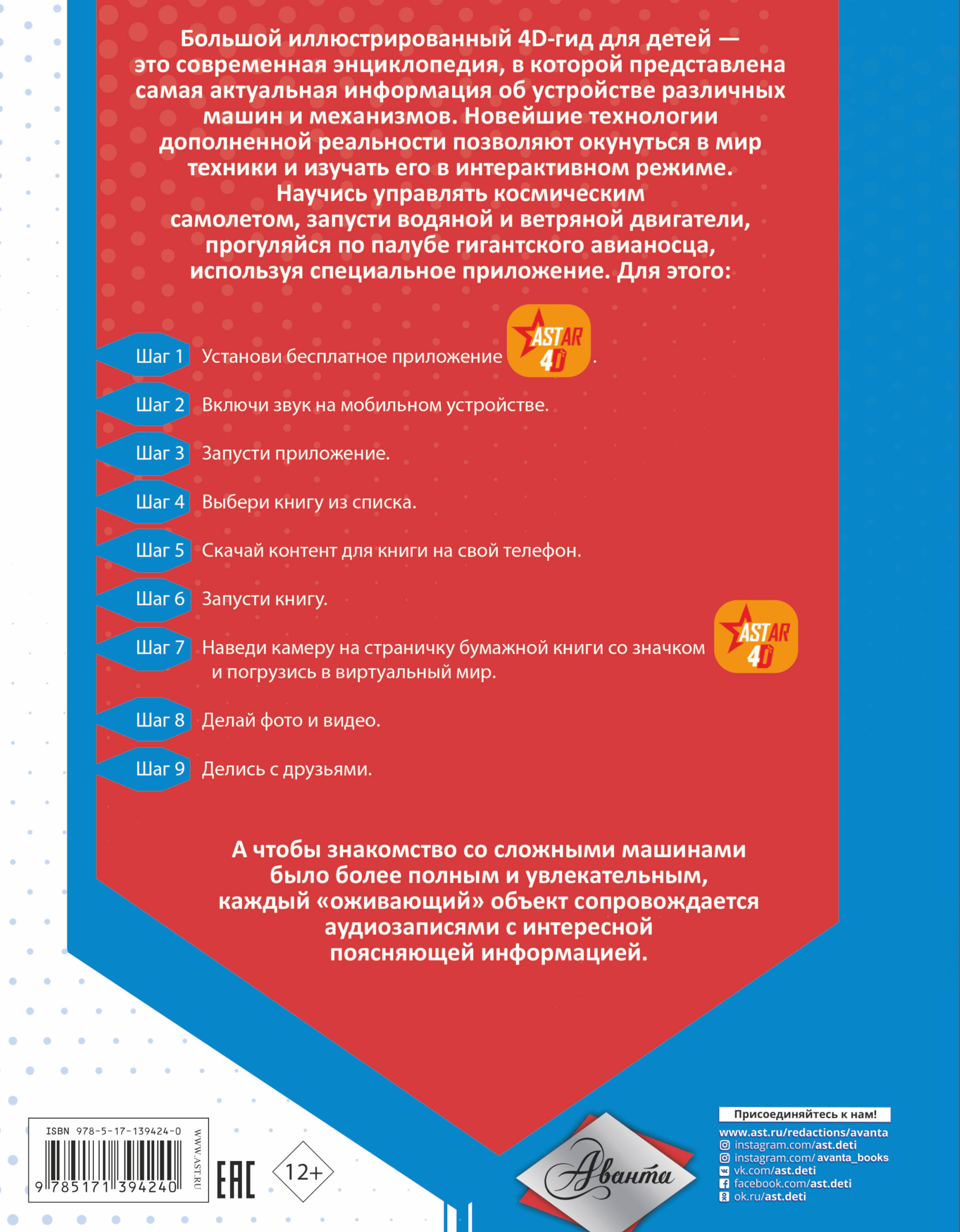 Современный человек уже не представляет свою жизнь без возможной техники. Он использует ее везде: дома и в путешествии, на стройке и в поле, в небе и под водой. Ну а покорить космос без сложнейшей техники и вовсе было бы невозможно! Эта необычная 4D-энциклопедия не только расскажет тебе, как устроены различные машины и механизмы, но и позволит заглянуть внутрь некоторых из них. Ты сможешь сравнить, как работает ветряной двигатель и двигатель внутреннего сгорания, попробуешь себя в роли водителя самосвала и пилота самолета, побываешь на борту ледокола и авианосца. Картинки прямо на страницах книги становятся объемными, движутся, изменяются в размерах, а еще их сопровождают познавательные аудиозаметки, из которых ты узнаешь еще больше о технике, машинах и механизмах. Для среднего и старшего школьного возраста.