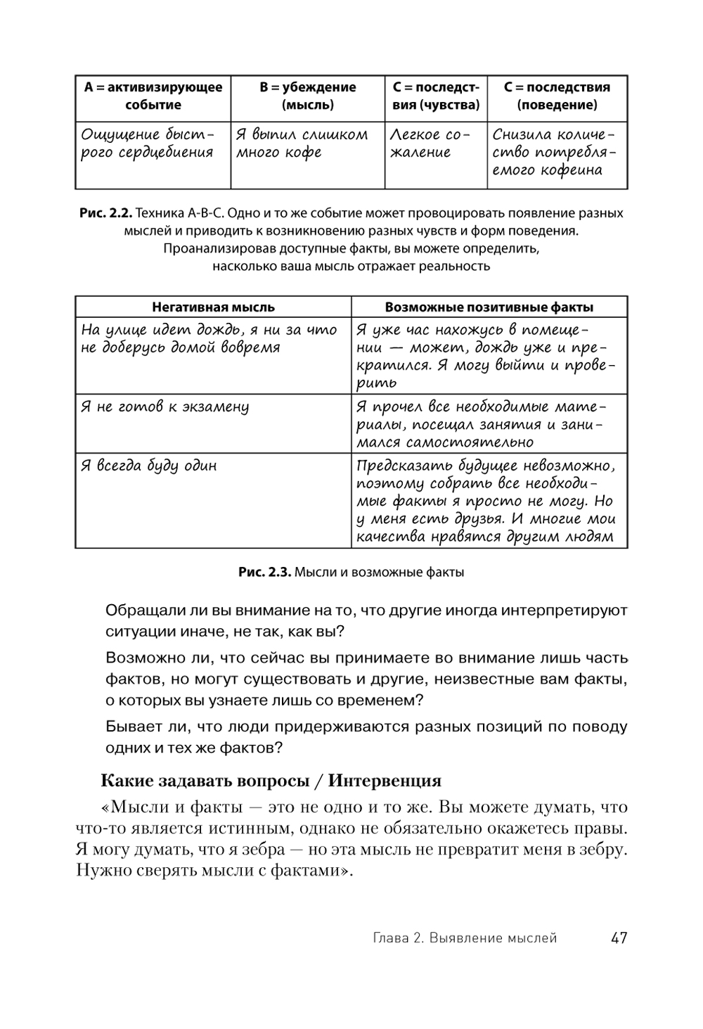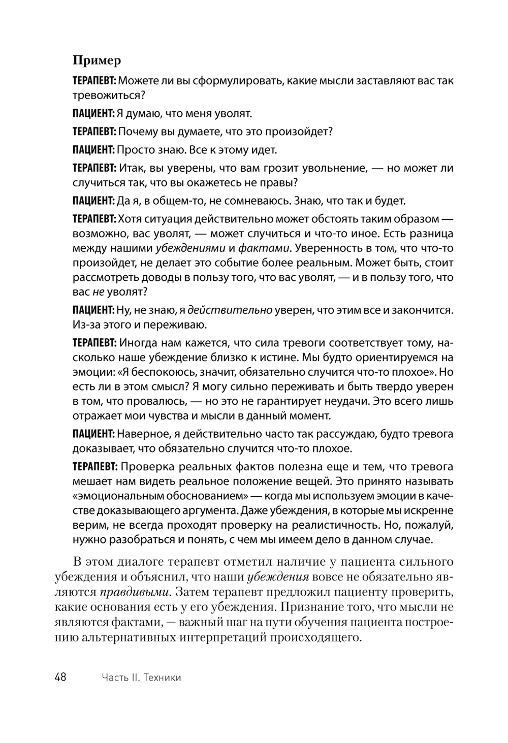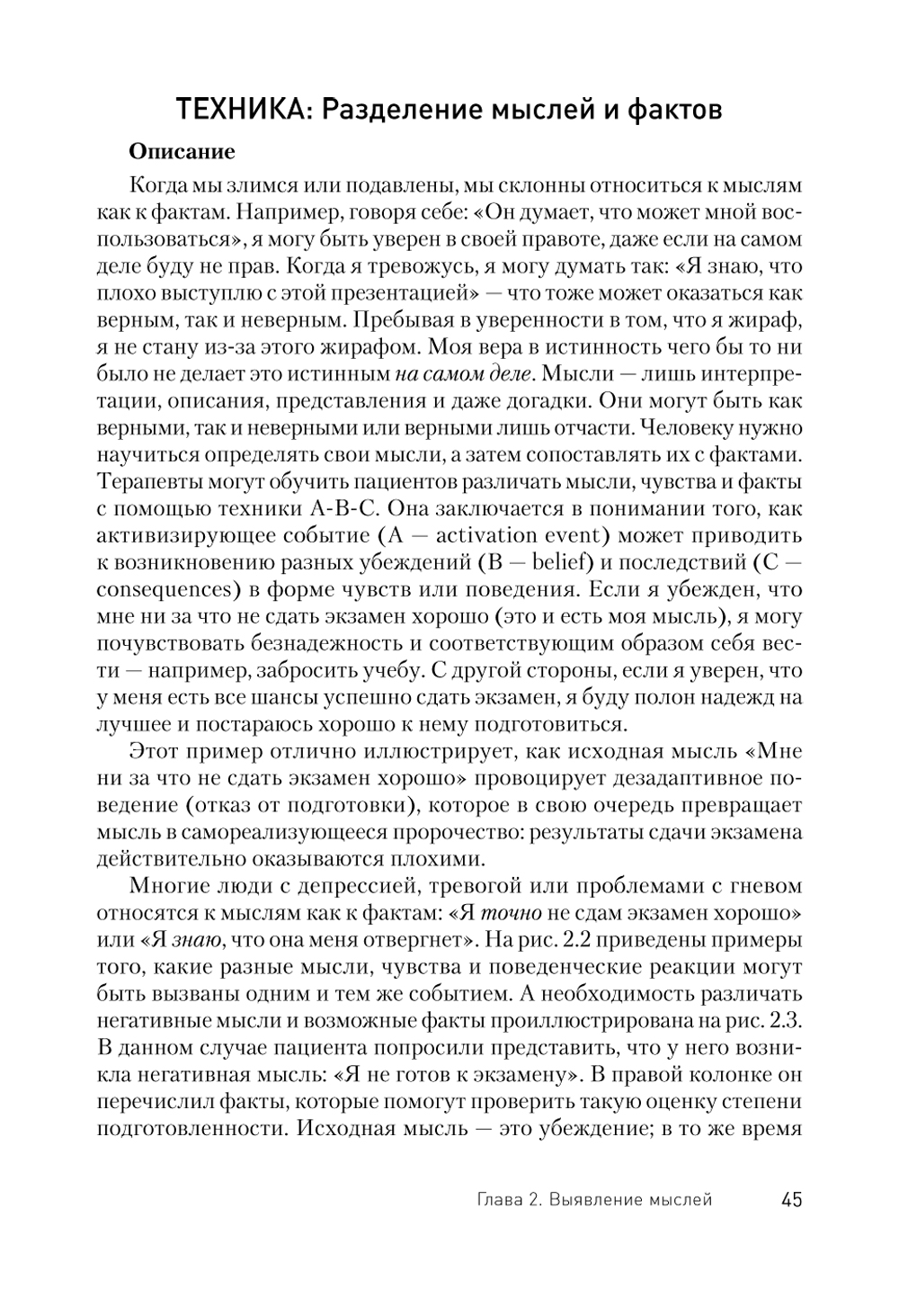 Книга Роберта Лихи незаменима для специалистов и студентов, которые работают по методике когнитивно-поведенческой психотерапии. Автор описывает способы помочь клиентам выявить и изменить мысли, провоцирующие создание проблем, основные убеждения, приводящие к тревоге, модели самокритики и поиска одобрения. В этой книге он учит исследовать личные схемы мышления, справляться с болезненными эмоциями, достигать целей. Каждая техника включает в себя яркие примеры и сопровождена диалогами.