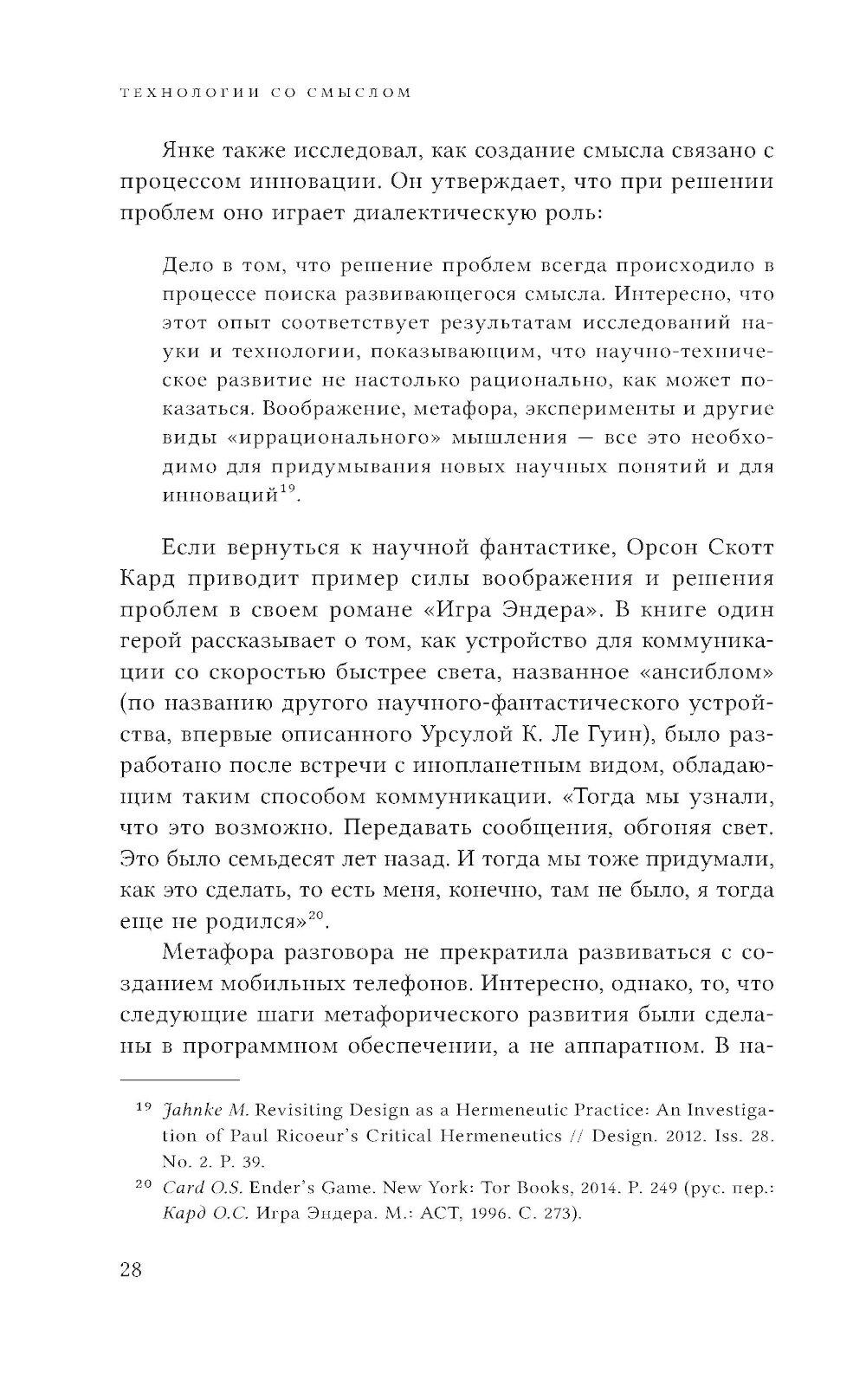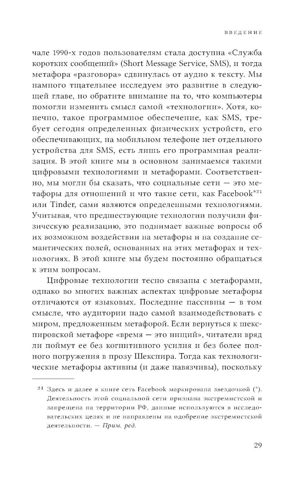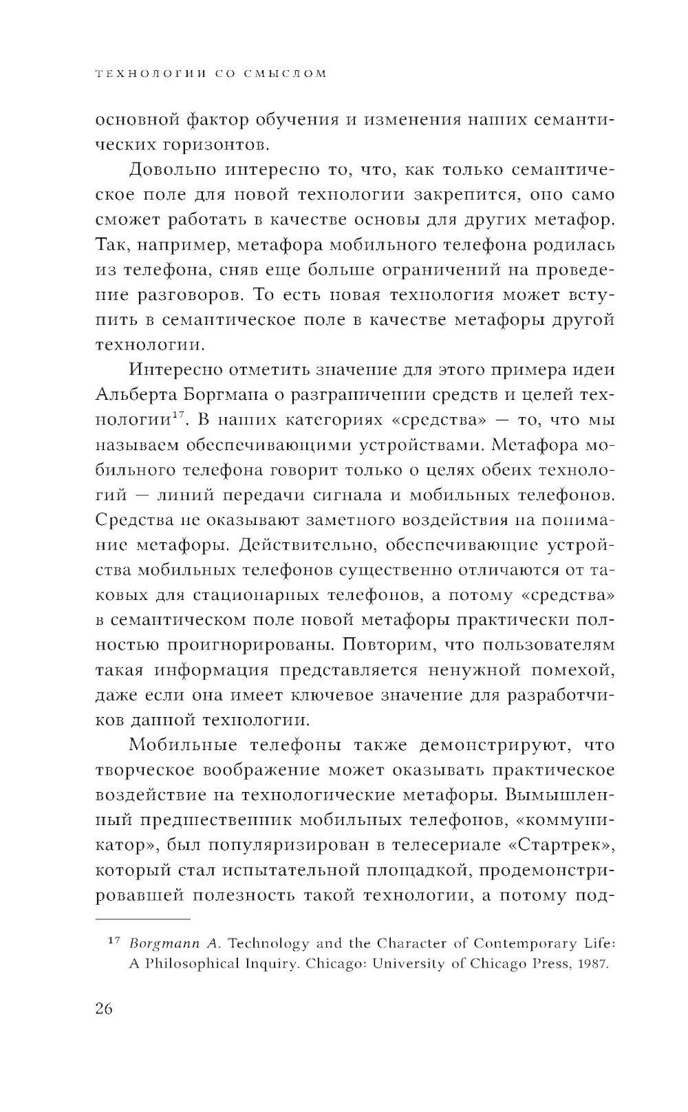 Смартфоны стали неотъемлемой частью нашей жизни и изменили наши представления о мире. Социальные сети заставили нас по-новому взглянуть на дружбу, воспоминания и т. д. Для современных подростков «разговор» может означать что угодно - от переписки в мессенджерах до живого общения. Эрик Чоун и Фернанду Насименту исследуют, как цифровые технологии влияют на жизнь каждого из нас. Между нами и цифровыми технологиями существует постоянная обратная связь: мы их используем, а они при этом меняют нас. Это взаимодействие рассматривается в книге с т очки зрения философии и когнитивной науки. Авторы изучают воздействие цифровых технологий на смысл и его изменения во времени, анализируют их влияние на обучение и внимание человека. Они считают, что приложения обрели некую самостоятельность, которой не было у ранних технологий. Но мы, в свою очередь, можем отстаивать самостоятельность, критически оценивая приложения и технологии в целом. Книга адресована культурологам, специалистам в области цифровых медиа, а также всем, кого интересует этическое значение цифровых технологий.| Издательство | ИД Высшей школы экономики |