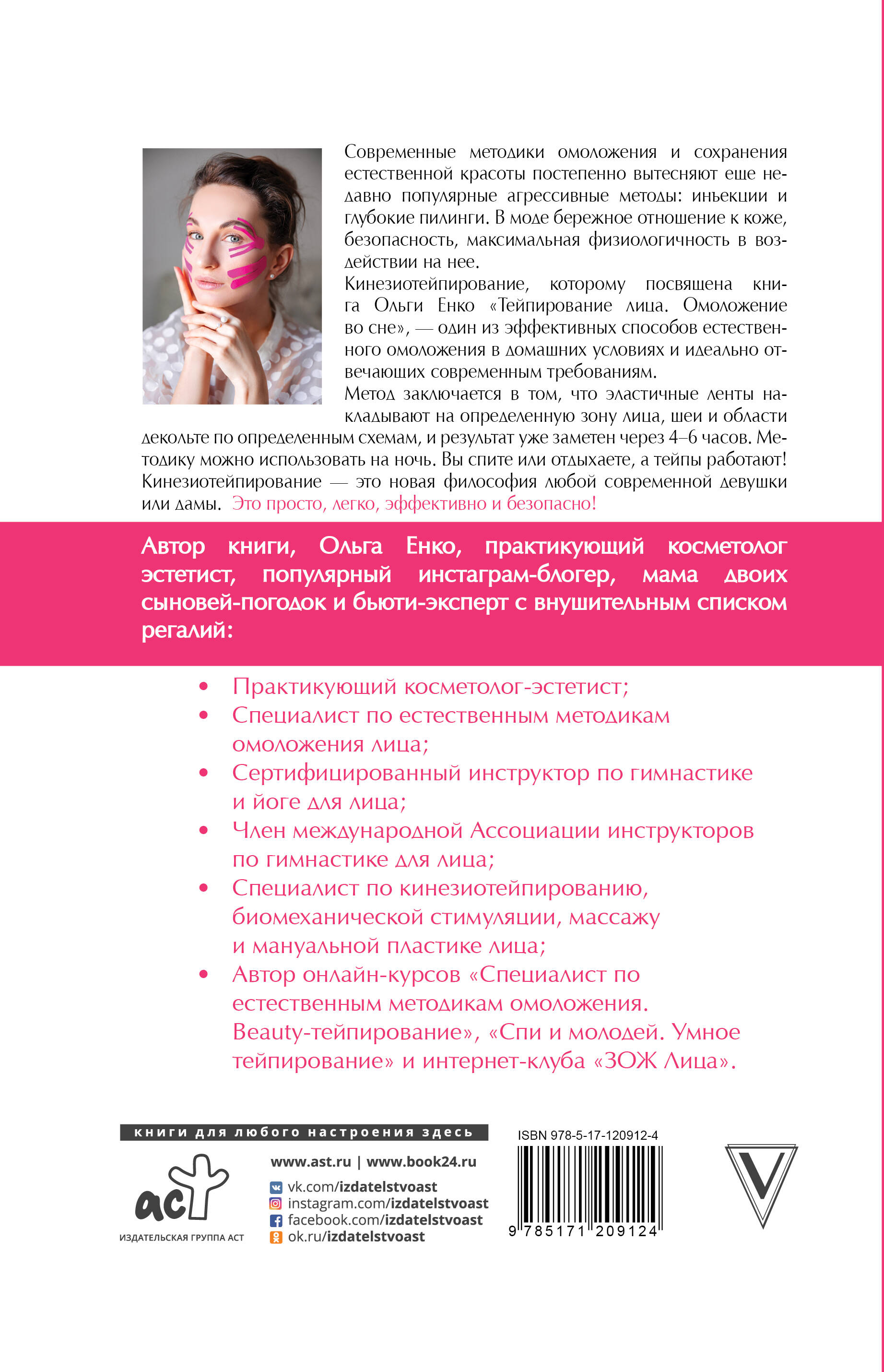 Автор книги, Ольга Енко, практикующий косметолог эстетист, популярный инстаграм-блогер, мама двоих сыновей-погодок и бьюти эксперт с внушительным списком регалий: • Практикующий косметолог-эстетист; • Специалист по естественным методикам омоложения лица; • Сертифицированный инструктор по гимнастике и йоге для лица; • Член международной Ассоциации инструкторов по гимнастике для лица; • Специалист по кинезиотейпированию, биомеханической стимуляции, массажу и мануальной пластике лица; • Автор онлайн-курсов «Специалист по естественным методикам омоложения. Beauty-тейпирование», «Спи и молодей. Умное тейпирование» и Интернет-клуба «ЗОЖ Лица».| Издательство | Издательство "АСТ" |