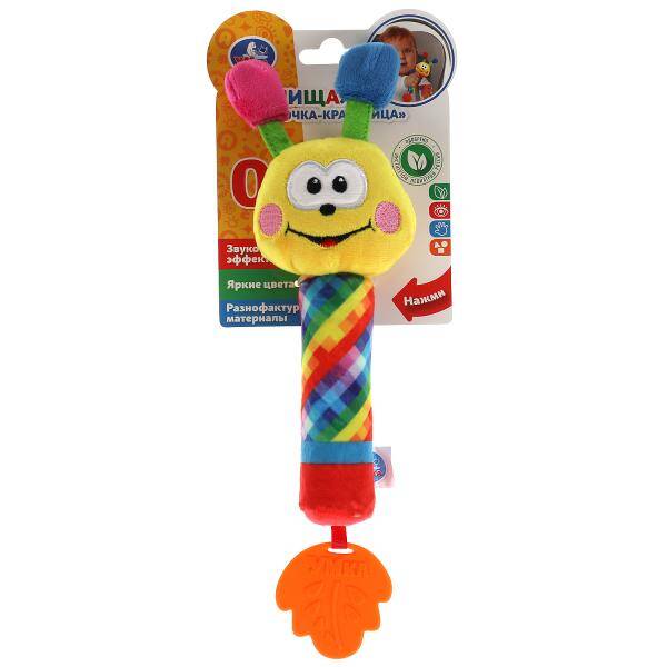 Текстильная погремушка с пищалкой "Бабочка" ТМ "УМка" разработана специально для самых маленьких: - гремящие шарики - пищалка - разнофактурные материалы - прорезыватель в виде листочка Эта погремушка в виде милой зверюшки, выполненная в ярких цветах из очень мягкого и гипоаллергенного материала. При нажатии игрушка издаёт забавный пищащий звук, а если её потрясти - весело загремят шарики, надежно спрятанные внутри. Прорезыватель интересной формы из качественного безопасного материала пригодится малышу, когда у него будут резаться зубки. Игра с погремушкой-пищалкой ТМ "УМка" развивает: - слуховое восприятие - тактильные навыки - моторику - цветовосприятие Размер: 7 х 20 х 5 см. Материал: пластмасса + текстиль. Рекомендовано детям раннего ясельного возраста.| Издательство | С-Маркет ООО |