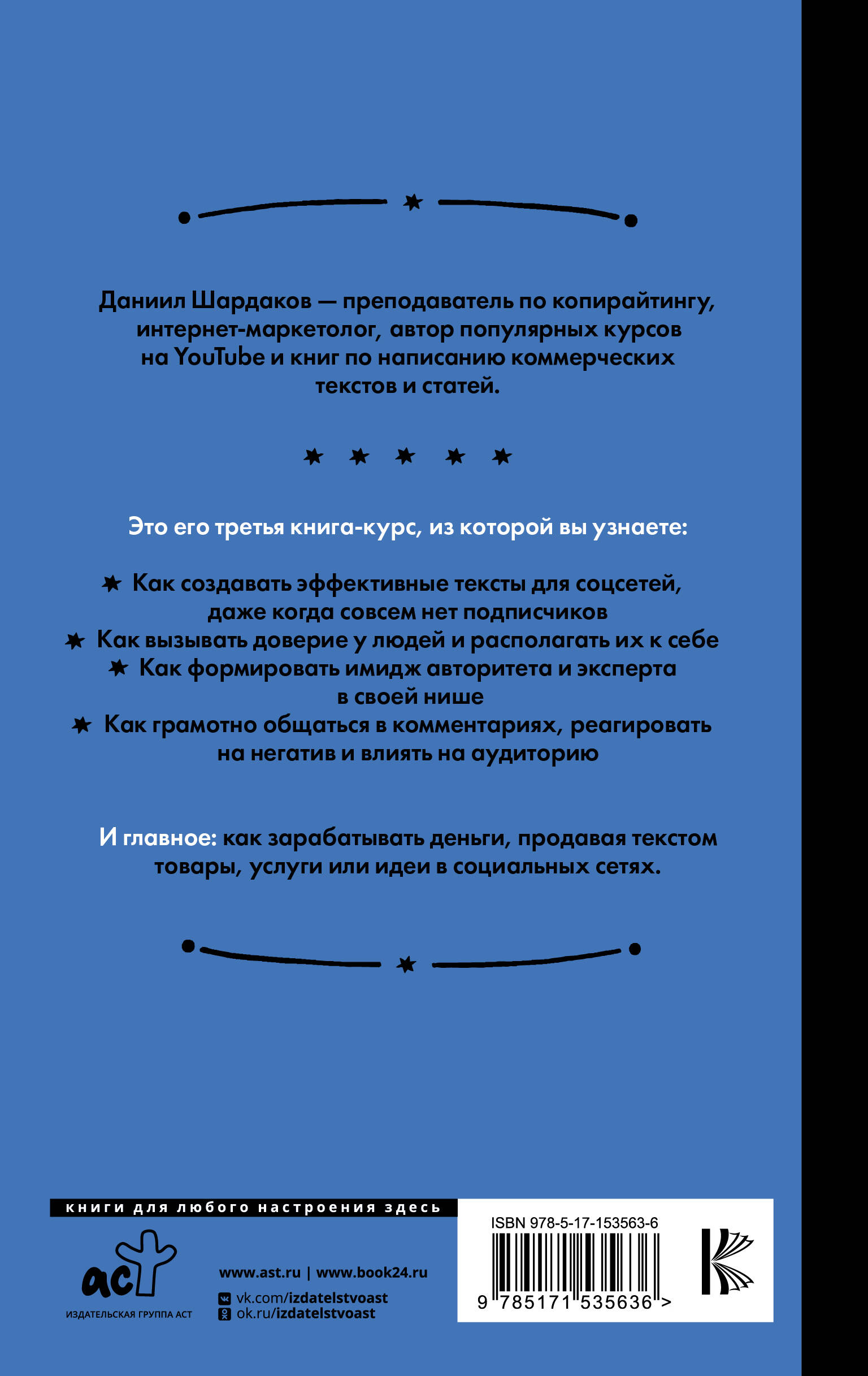 Даниил Шардаков - преподаватель по копирайтингу, интернет-маркетолог и автор популярных курсов на YouTube и книг по написанию коммерческих текстов и статей. Это его третья книга-курс, из которой вы узнаете: - Как создавать эффективные тексты для соцсетей, даже когда совсем нет подписчиков - Как вызывать доверие у людей и располагать их к себе - Как формировать имидж авторитета и эксперта в своей нише - Как грамотно общаться в комментариях, реагировать на негатив и влиять на аудиторию И, главное: как зарабатывать деньги, продавая текстом товары, услуги или идеи в социальных сетях.| Издательство | ИЗДАТЕЛЬСТВО "АСТ" |