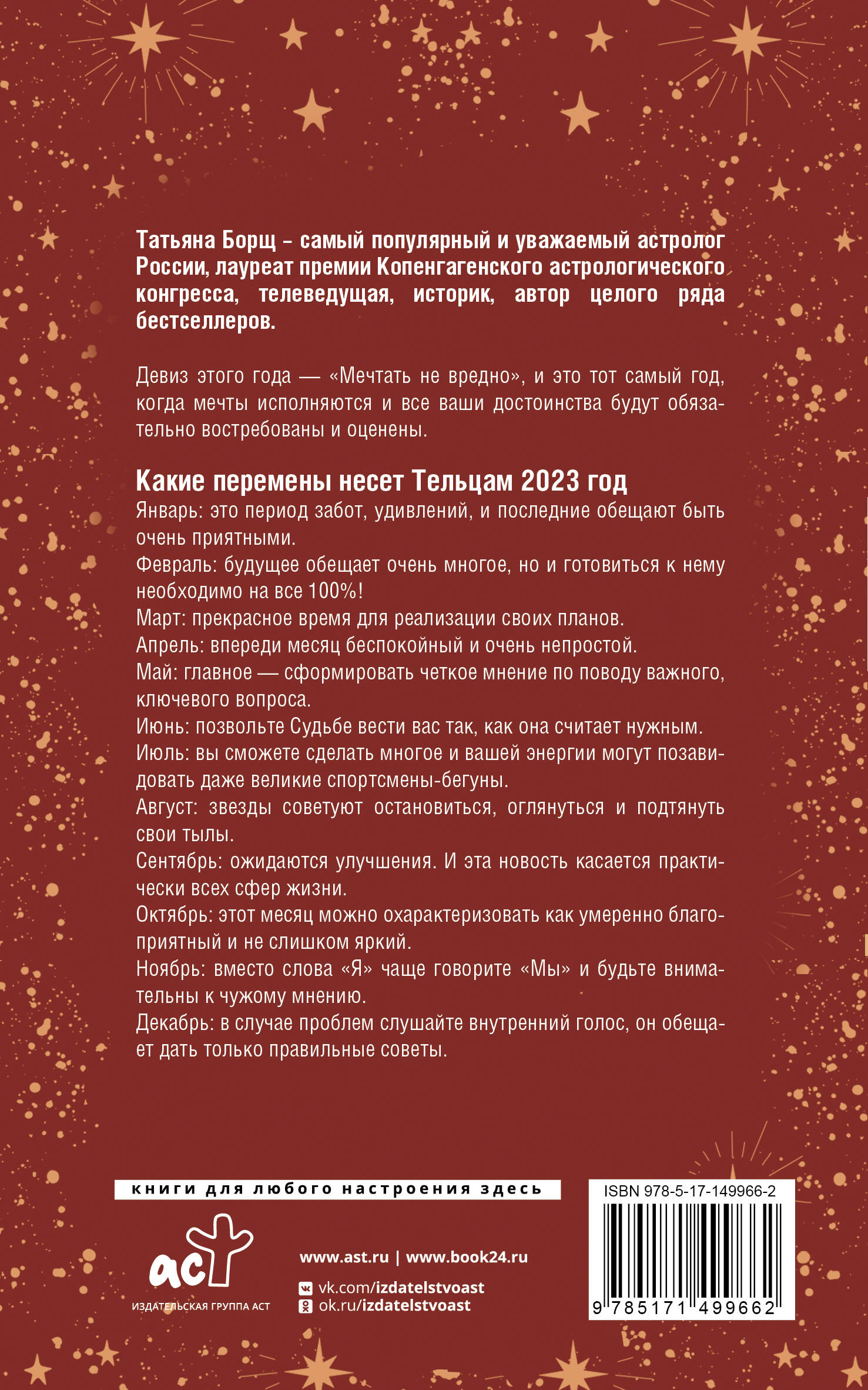 Гороскопы на 2023 год для каждого знака зодиака от одного из самых популярных и уважаемых астрологов России Татьяны Борщ. Календари серии расскажут, что ждет вас в сфере работы, личной жизни, семьи и творческой реализации в каждый из месяцев нового года. Вы сможете заведомо подготовиться к непростым периодам и получить четкие рекомендации, которые помогут навести порядок в жизни вопреки неудачному расположению планет.| Издательство | АСТ |