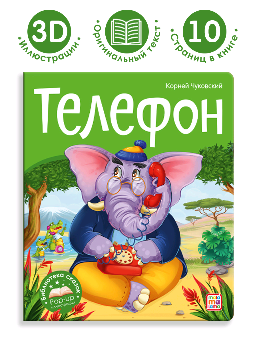 Серия «Библиотека сказок» - это любимые сказки от торговой марки Malamalama. «Телефон» Корнея Чуковского - всеми любимая история в новом оформлении. На ярких страницах книги перед вашим малышом оживут персонажи, любопытные и взволнованные, весёлые и милые. Объёмные pop-up элементы помогут окунуться в необычную атмосферу. А классический текст стихотворения знаменитого писателя будет по душе и взрослым, и детям!| Издательство | Маламалама |