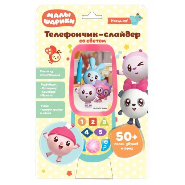 Аннотация: Телефончик-слайдер МАЛЫШАРИКИ 50 песен,звуков,фраз.цифры,формы,цвета.блист.бат. Умка в кор.120шт