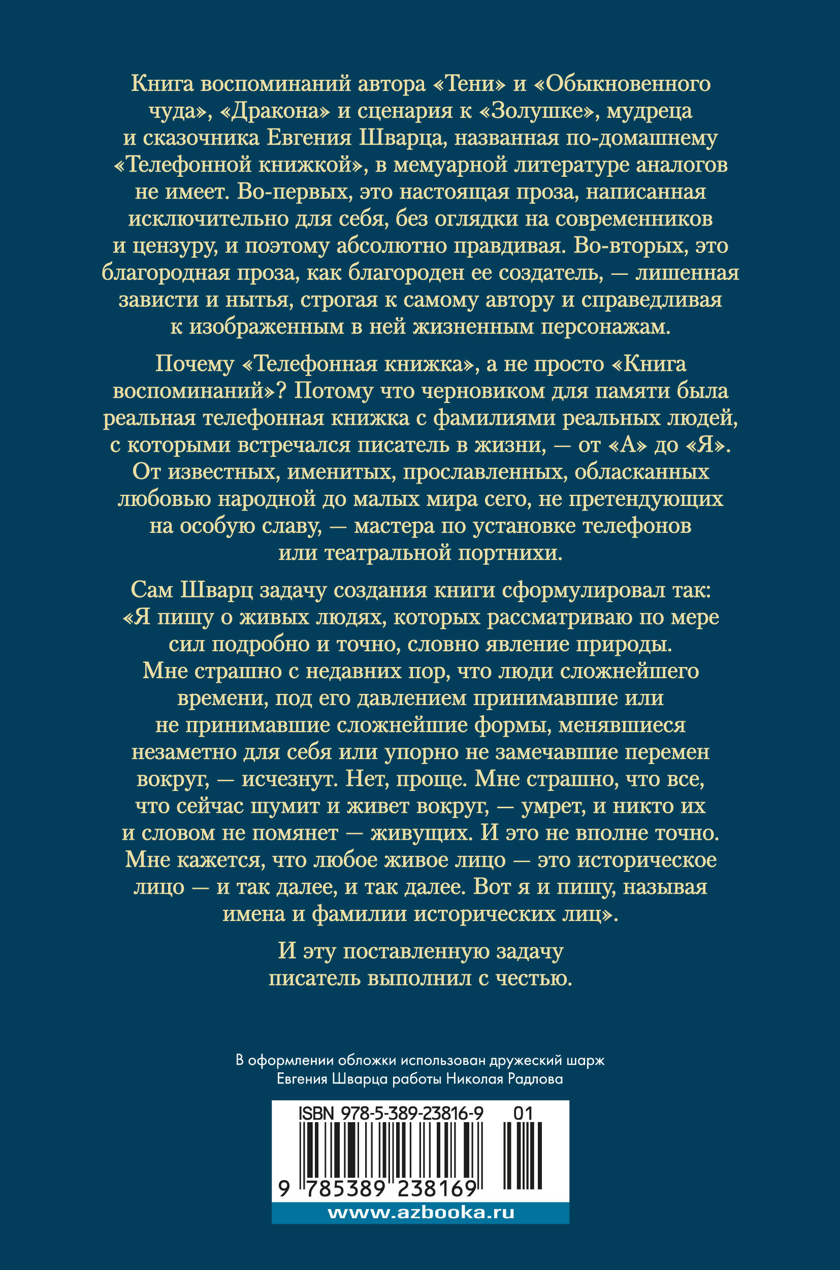 Книга воспоминаний автора "Тени" и "Обыкновенного чуда", "Дракона" и сценария к "Золушке", мудреца и сказочника Евгения Шварца, названная по-домашнему "Телефонной книжкой", в мемуарной литературе аналогов не имеет. Во-первых, это настоящая проза, написанная исключительно для себя, без оглядки на современников и цензуру, и поэтому абсолютно правдивая. Во-вторых, это благородная проза, как благороден ее создатель, - лишенная зависти и нытья, строгая к самому автору и справедливая к изображенным в ней жизненным персонажам. Почему "Телефонная книжка", а не просто "Книга воспоминаний"? Потому что черновиком для памяти была реальная телефонная книжка с фамилиями реальных людей, с которыми встречался писатель в жизни, - от "А" до "Я". От известных, именитых, прославленных, обласканных любовью народной до малых мира сего, не претендующих на особую славу, - мастера по установке телефонов или театральной портнихи. Сам Шварц задачу создания книги сформулировал так: "Я пишу о живых людях, которых рассматриваю по мере сил подробно и точно, словно явление природы. Мне страшно с недавних пор, что люди сложнейшего времени, под его давлением принимавшие или не принимавшие сложнейшие формы, менявшиеся незаметно для себя или упорно не замечавшие перемен вокруг, - исчезнут. Нет, проще. Мне страшно, что все, что сейчас шумит и живет вокруг, - умрет, и никто их и словом не помянет - живущих. И это не вполне точно. Мне кажется, что любое живое лицо - это историческое лицо - и так далее, и так далее. Вот я и пишу, называя имена и фамилии исторических лиц". И эту поставленную задачу писатель выполнил с честью.| Издательство | Азбука-Аттикус Издат.группа ООО |
