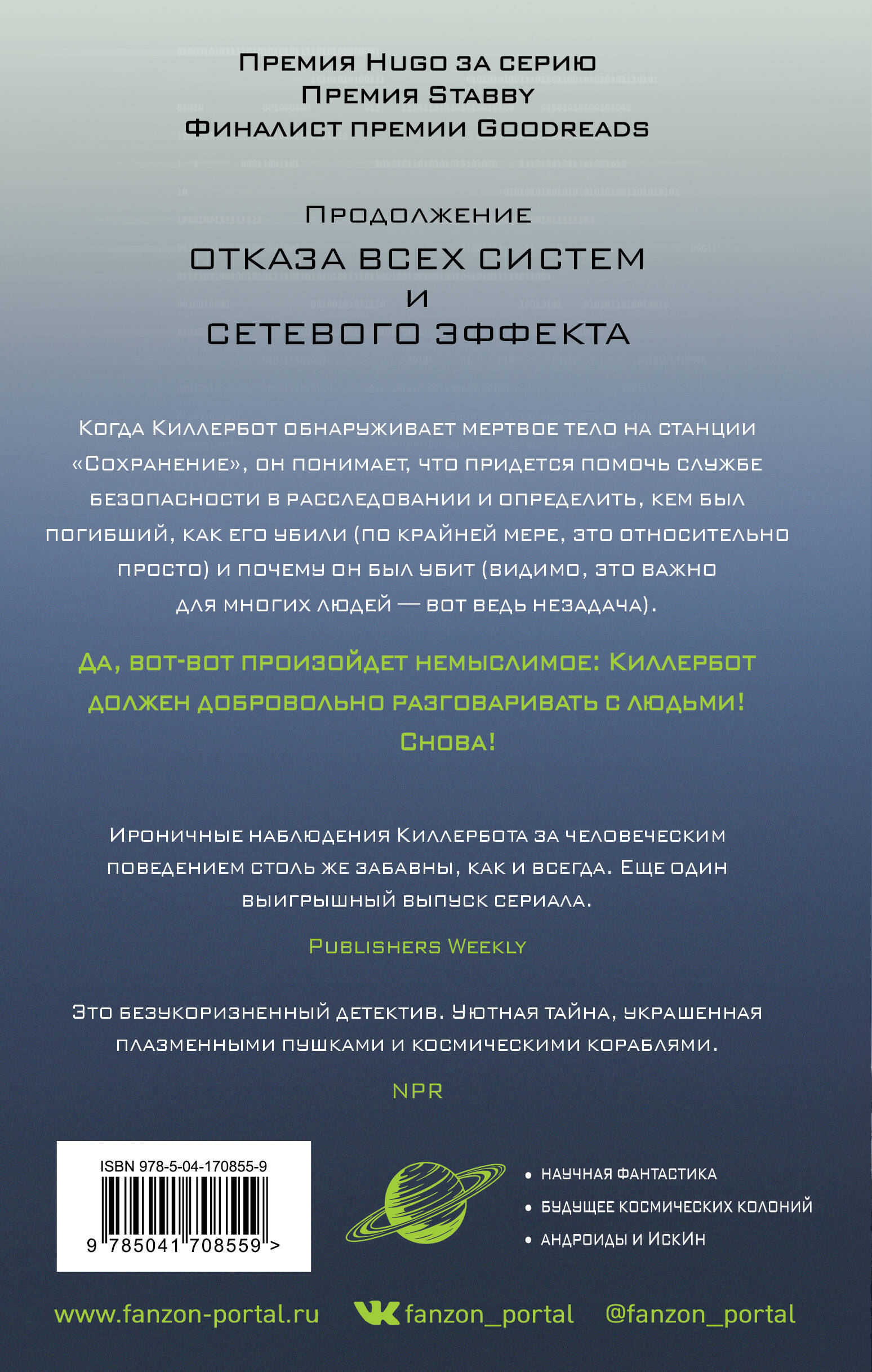Когда Киллербот обнаруживает мертвое тело на станции «Сохранение», он понимает, что придется помочь службе безопасности в расследовании и определить, чье это тело, как его убили (по крайней мере, это относительно просто) и почему оно было убито (видимо, это важно для многих людей - вот ведь незадача). Да, вот-вот произойдет немыслимое: Киллербот должен добровольно разговаривать с людьми! Снова! «Портрет самого человечного не-человека». - Аннали Ньюиц «Уэллс создала главного героя, который вызывает привыкание... Киллербот продолжает радовать нас своим интеллектом и едкими комментариями, которые касаются природы человечества». - Library Journal «Ироничные наблюдения Киллербота за человеческим поведением столь же забавны, как и всегда. Еще один выигрышный выпуск сериала». - Publishers Weekly «Это безукоризненный детектив. Уютная тайна, украшенная плазменными пушками и космическими кораблями». - NPR| Издательство | ООО "Издательство "Эксмо" |
