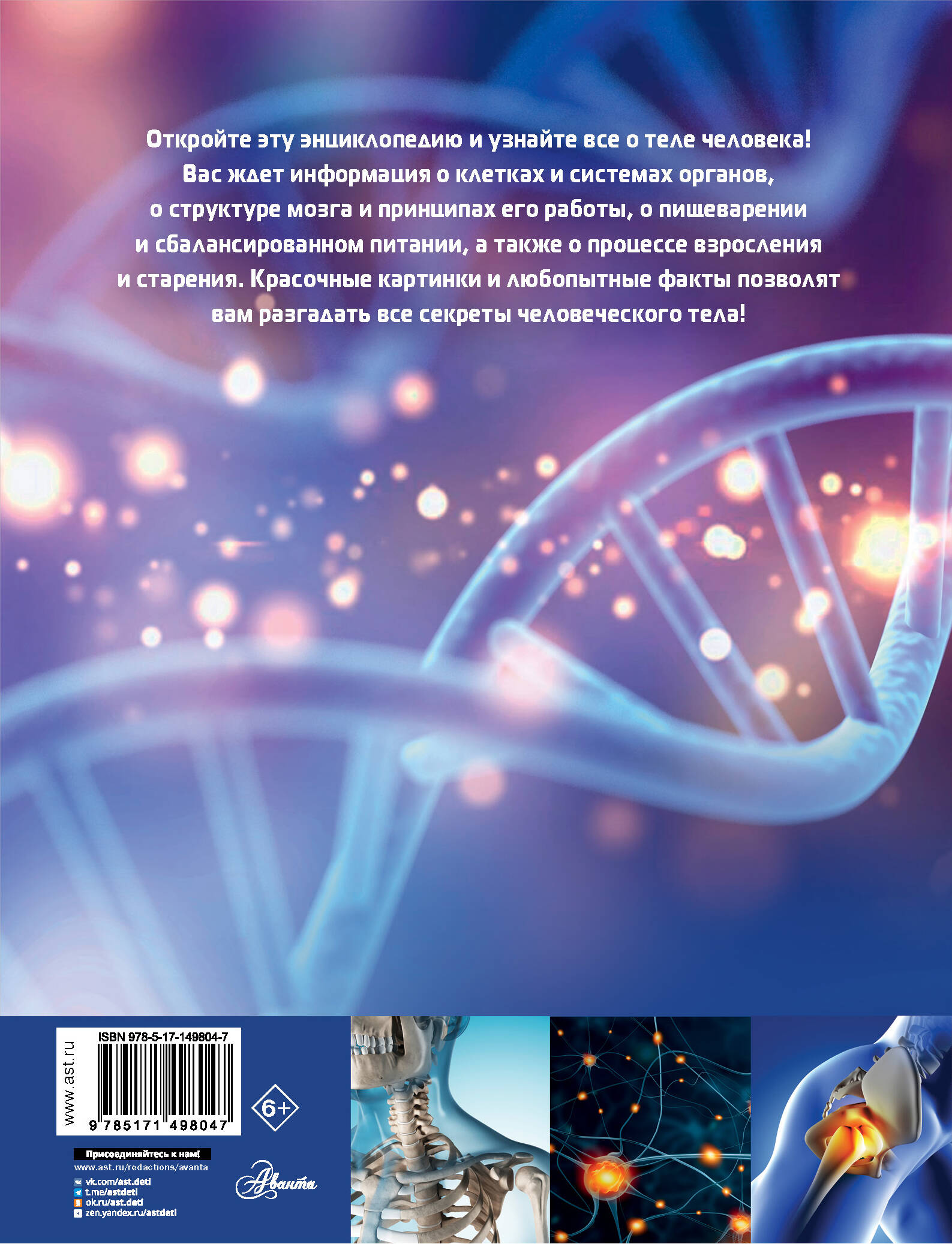 "Тело человека" - это красочная энциклопедия, в которой вас ждет подробная информация об устройстве человеческого тела. Вы узнаете больше о внутренних и внешних органах, химическом составе тела человека и важнейших процессах жизнедеятельности: дыхании, кровообращении, пищеварении и взрослении. В каждом разделе вас также ждет один удивительный и неожиданный факт о человеке, который поможет вам удивить своих друзей и близких. Для среднего школьного возраста.| Издательство | АСТ |