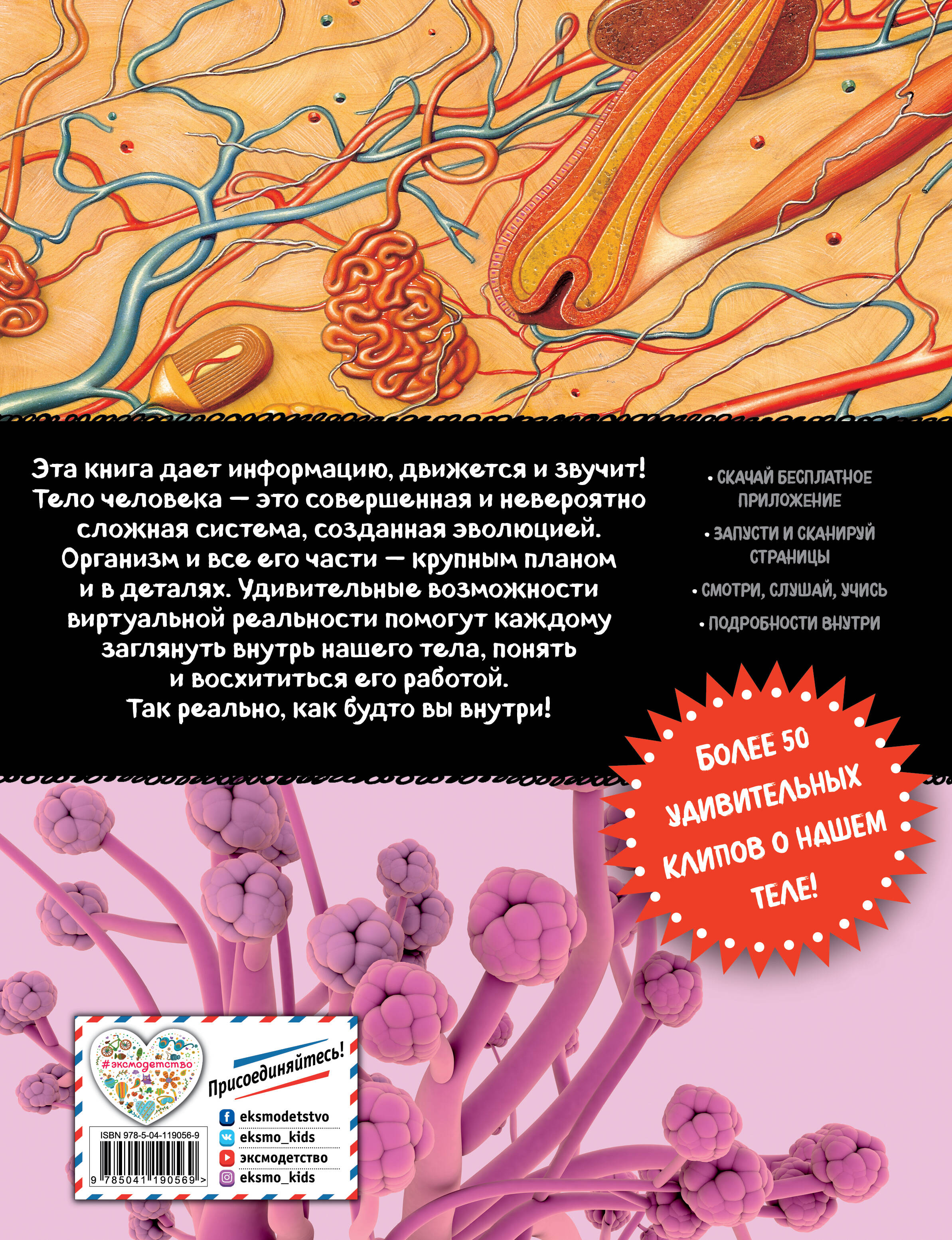 Наше тело - совершенная и невероятно сложная система, созданная эволюцией. Сколько триллионов клеток во взрослом человеке? О чем расскажет анализ ДНК? Какая мышца в нашем теле самая «быстрая»? Всё о строении и функционировании нашего организма - в умной книге для умных читателей, которые ищут самую новую и достоверную информацию. Эта книга не только расскажет, но и покажет вам все детали вашего тела. Более 50 удивительных клипов о работе систем нашего организма, а также ответы на многие вопросы Узнай и будь в курсе! Удивительные возможности виртуальной реальности помогут каждому заглянуть внутрь нашего тела, понять и восхититься его работой. Так реально, как будто ты внутри! Ссылка на бесплатное приложение и четкие инструкции внутри книги. Скачай, листай, слушай, смотри, удивляйся!| Издательство | ООО "Издательство "Эксмо" |