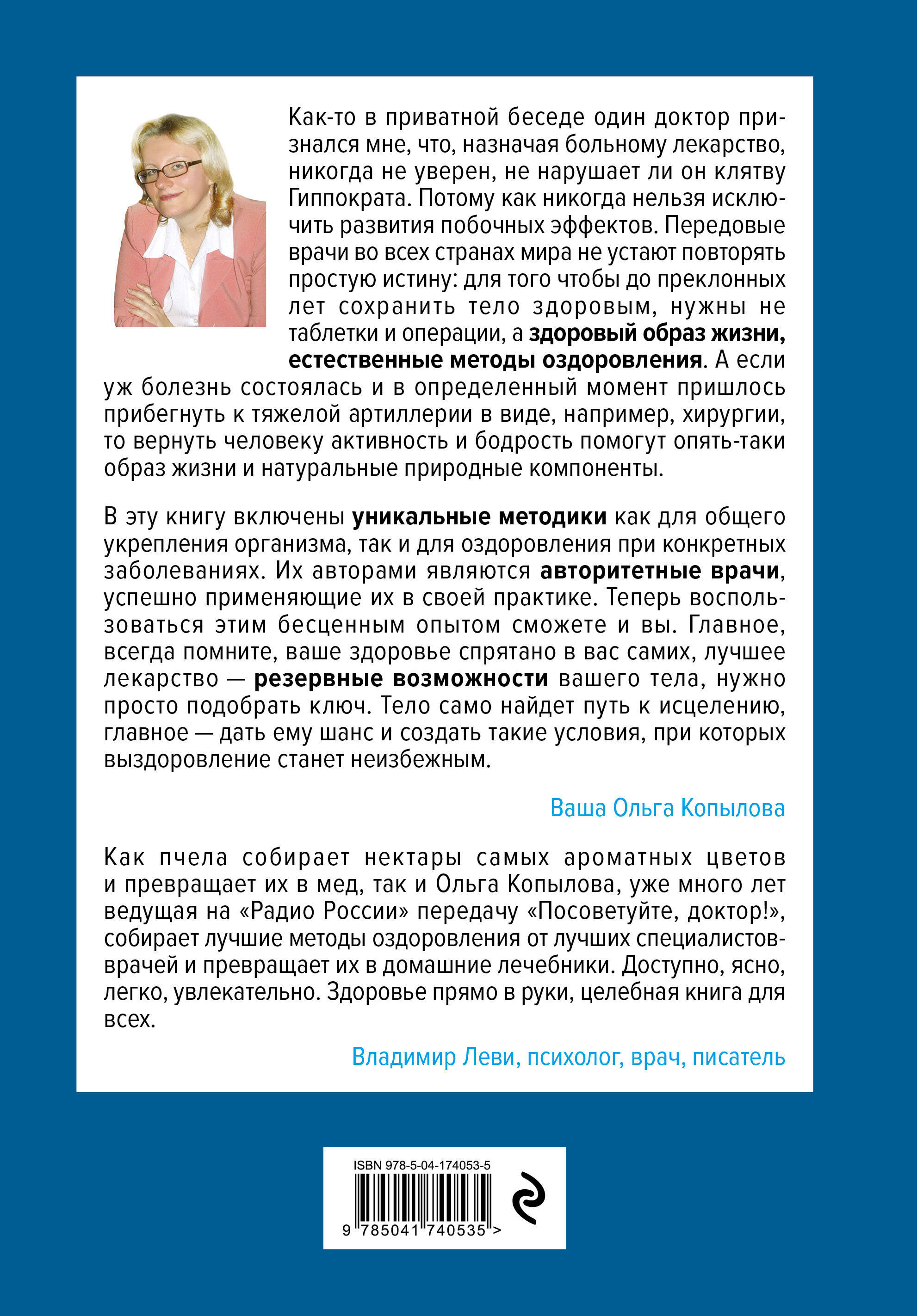 Можно и нужно оставаться здоровым в любом возрасте, и главные помощники - далеко не таблетки и операции. Здоровый образ жизни и естественные методы оздоровления способны поддерживать здоровье тела и психики до глубокой старости. К ним же стоит обратиться и тогда, когда нужно восстановиться после болезни или операции, вернуть активность и бодрость. В эту книгу вошли простые и эффективные методы оздоровления, авторами которых являются известные врачи с многолетней практикой. Внутри вы найдете тесты для оценки своего состояния, лечебные и укрепляющие упражнения для позвоночника, суставов и мышц, советы по борьбе с паническими атаками и по расслаблению, а также общие рекомендации по оздоровлению и поддержанию самочувствия. «Как пчела собирает нектары самых ароматных цветов и превращает их в мед, так Ольга Копылова, уже много лет ведущая на "Радио России" передачу "Посоветуйте, доктор!", собирает лучшие методы оздоровления от лучших специалистов-врачей и превращает их в домашние лечебники. Доступно, ясно, легко, увлекательно. Здоровье прямо в руки, целебная книга для всех». - ВЛАДИМИР ЛЕВИ - психолог, врач, писатель с мировым именем| Издательство | ООО "Издательство "Эксмо" |