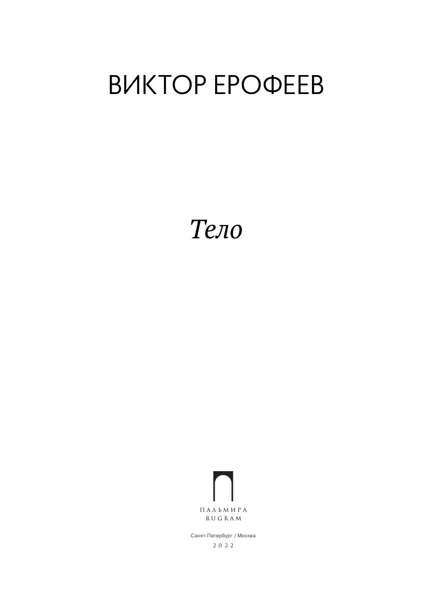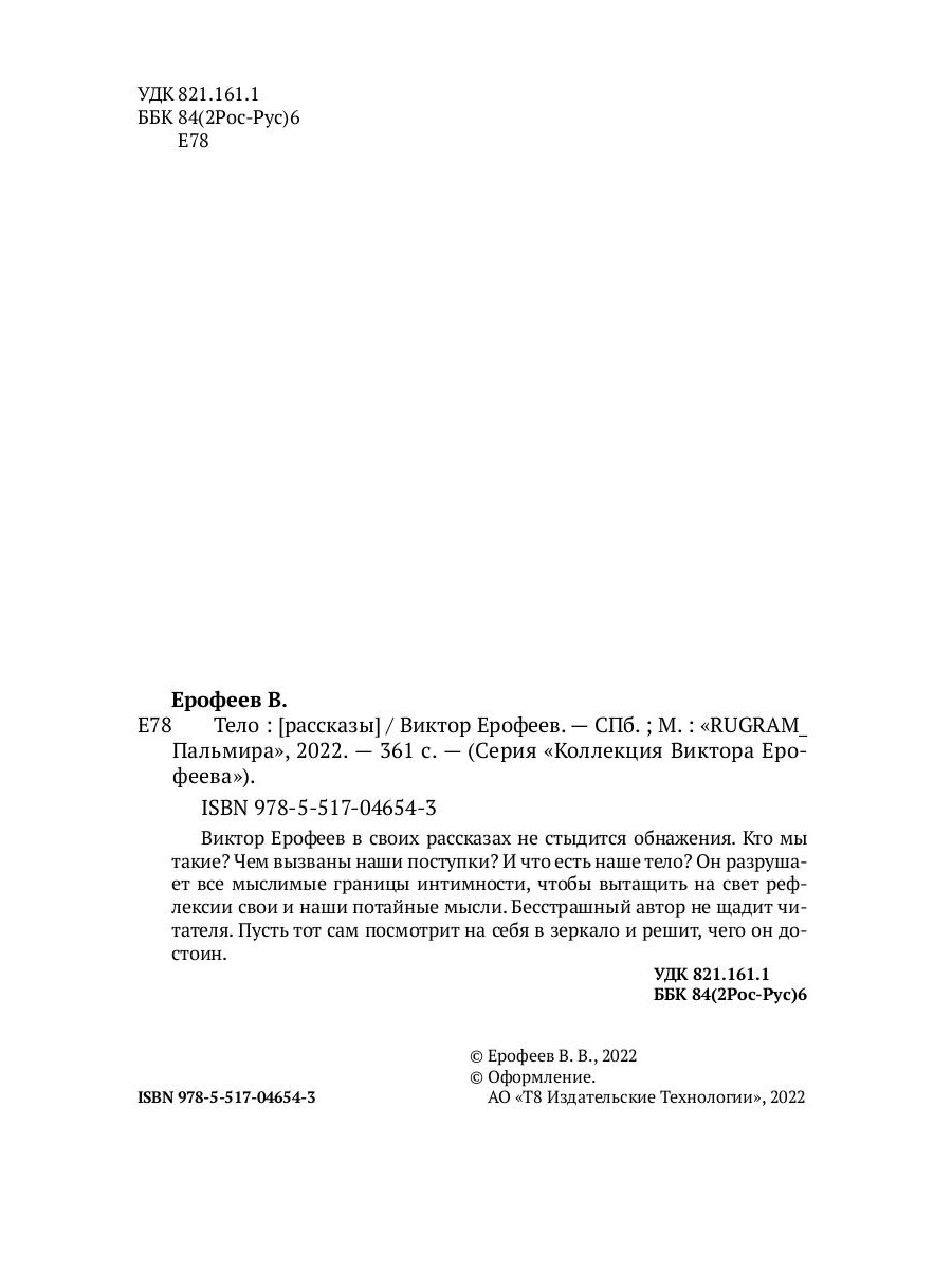 Виктор Ерофеев (р. 1947) - прозаик, пионер русского постмодернизма, снискавший скандальную репутацию ниспровергателя ценностей. Литературовед, видный деятель андеграунда, член Русского ПЕН-центра, лауреат премии имени В. В. Набокова. Его книги переведены на десятки языков и известны во всем мире. В эссе из сборника «Тело» Ерофеев рассматривает самое сокровенное - телесность, а заодно и русскую жизнь в непривычном ракурсе.