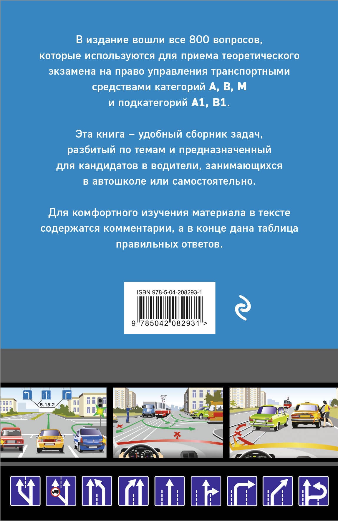 В издание вошли все 800 вопросов, которые используются для приема теоретического экзамена на право управления транспортными средствами категории «А», «В», «М» и подкатегорий «А1», «В1». Эта книга - удобный сборник задач, разбитый по темам и предназначенный для кандидатов в водители, занимающихся в автошколе или самостоятельно. Для комфортного изучения материала в тексте содержатся комментарии, а в конце дана таблица правильных ответов.