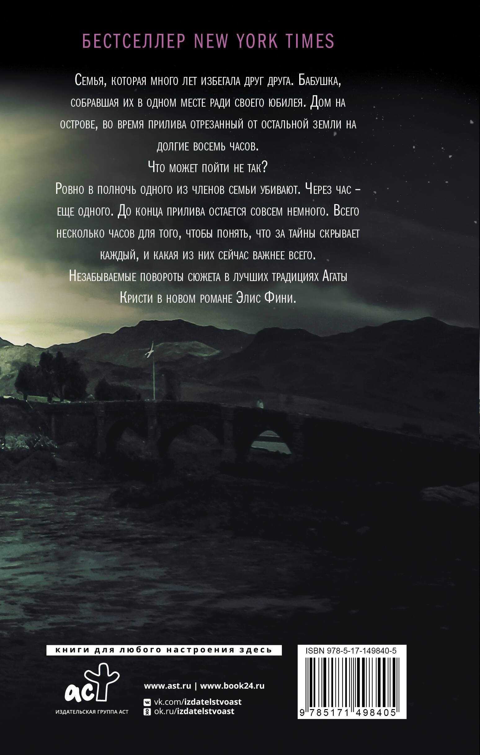 Семья, которая много лет избегала друг друга. Бабушка, собравшая их в одном месте, ради своего юбилея. Дом на острове, во время прилива отрезанный от остальной земли на долгие восемь часов. Что может пойти не так? Ровно в полночь одного из членов семьи убивают. Через час - еще одного. До конца прилива остается совсем немного. Всего несколько часов для того, чтобы понять, что за тайны скрывает каждый, и какая из них сейчас важнее всего. Незабываемые повороты сюжета в лучших традициях Агаты Кристи, в новом романе Элис Фини.| Издательство | ИЗДАТЕЛЬСТВО "АСТ" |