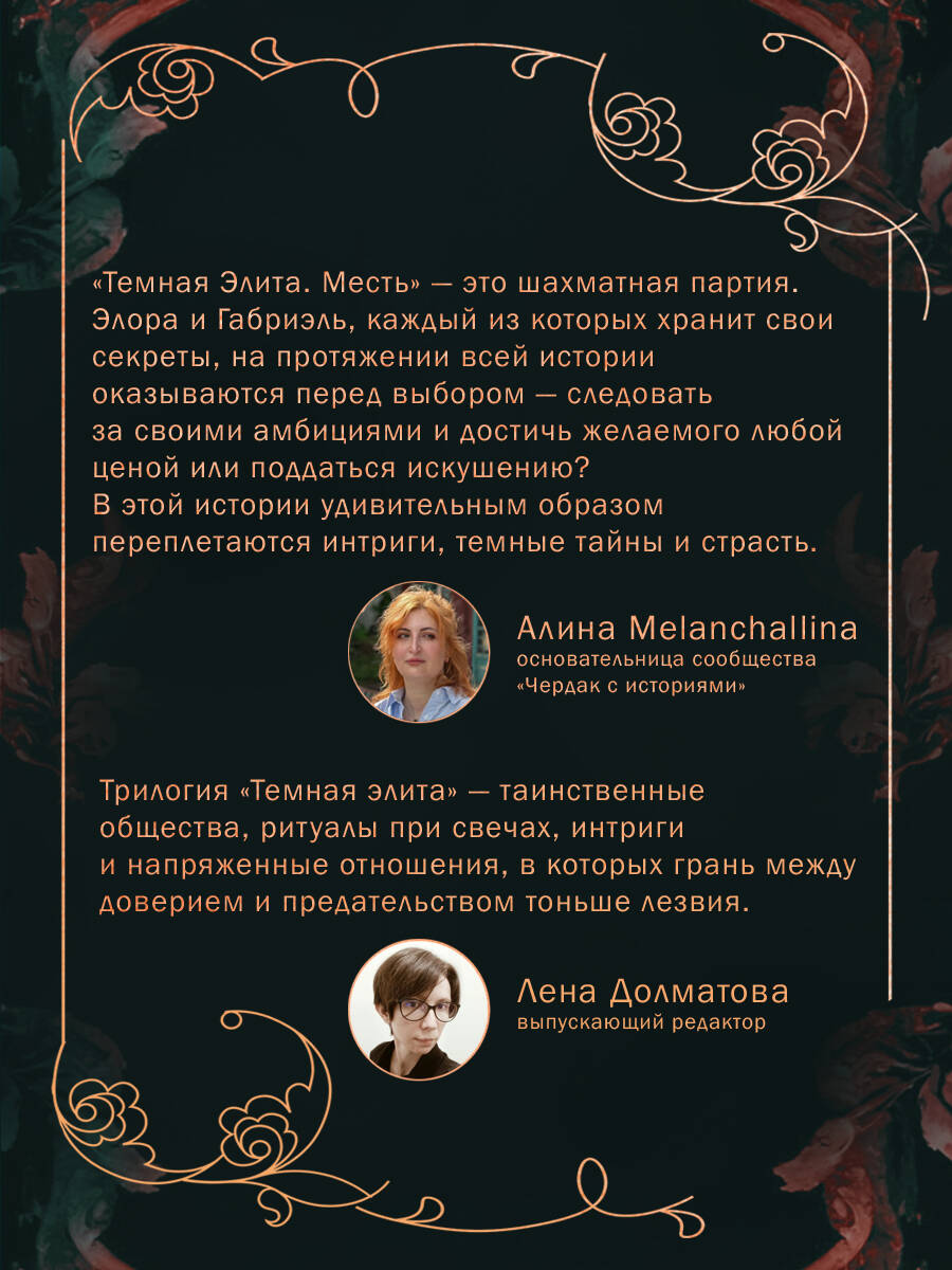 Опасные секреты. Тайные ритуалы. Запретные чувства. Первая книга атмосферной трилогии Юлии Хаусбург «Темная элита». Моментальный бестселлер SPIEGEL. Роскошное оформление: покет большого формата с эффектным цветным обрезом, дополняющим стильную темную эстетику. Элора мечтает принадлежать элитному братству «Фортуна». Габриэль - разрушить его изнутри. Вместе они оказываются в центре смертельно опасной игры, где чувства - слабость, а ложь - единственный способ выжить. «Темная Элита. Месть» - это шахматная партия. Элора и Габриэль, каждый из которых хранит свои секреты, на протяжении всей истории оказываются перед выбором - следовать за своими амбициями и достичь желаемого любой ценой или поддаться искушению? В этой истории удивительным образом переплетаются интриги, темные тайны и страсть. - Алина Melanchallina, основательница сообщества «Чердак с историями»| Издательство | ООО "Издательство "Эксмо" |