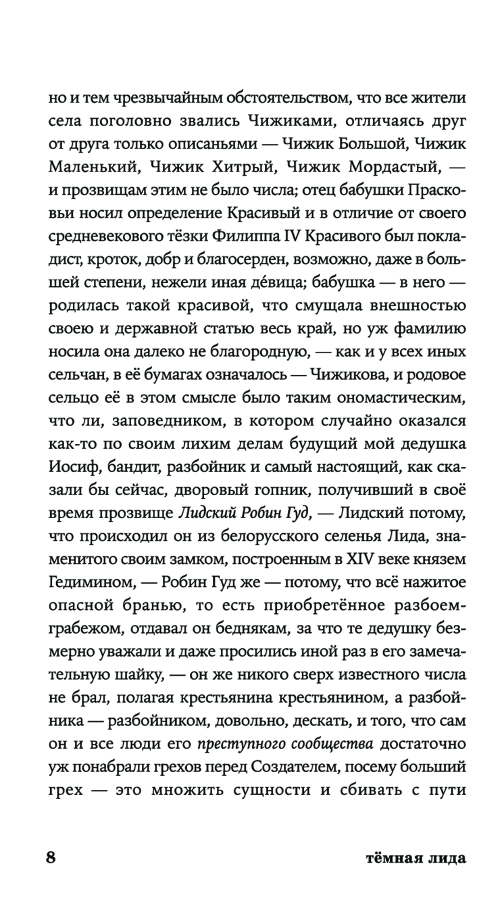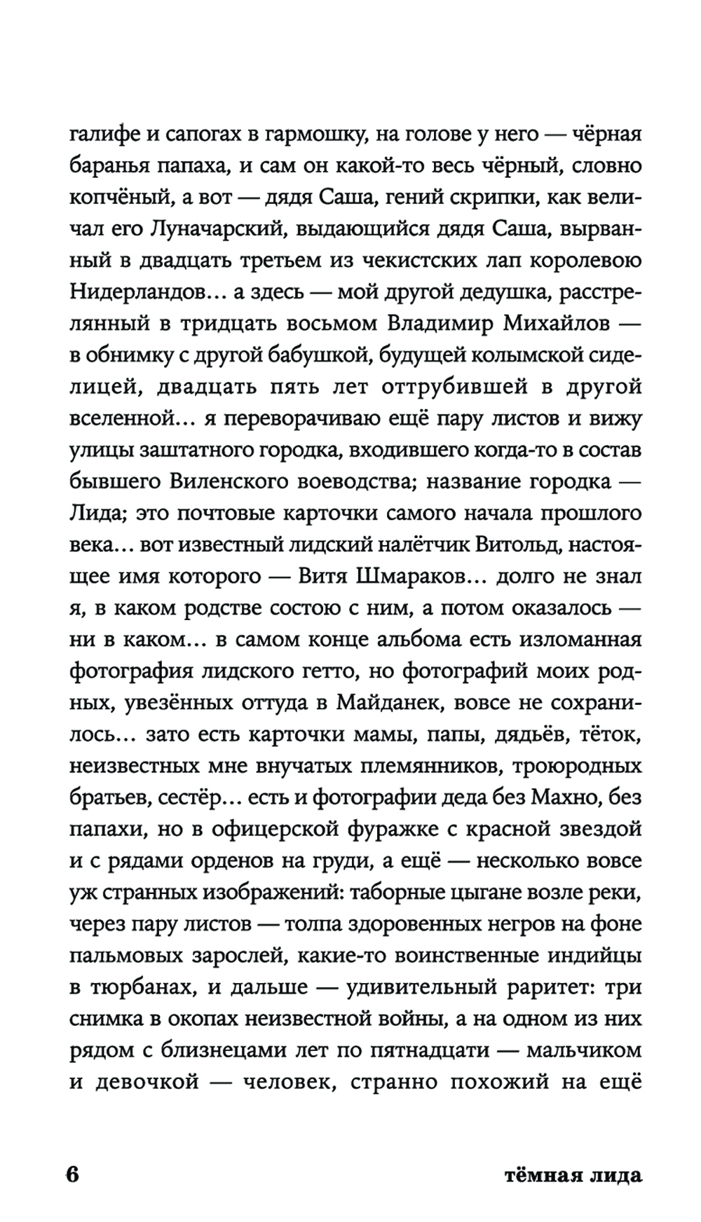 В книге Владимира Лидского собраны повести и рассказы, герои которых неразрывно связаны с Лидой - небольшим белорусским городом, ставшим свидетелем трагических событий истории. Для автора это своеобразное Макондо - полумифическое родовое гнездо, где когда-то жили его дальние предки. Всматриваясь в судьбы своих героев, Лидский разворачивает перед нами всеобъемлющее историческое полотно первой половины XX века - страшного времени смуты, тьмы и потрясений, когда «космический гул нависал над страной». Захватывающие сюжеты книги перетекают один в другой; повести и рассказы написаны одним предложением без заглавных букв, словно фрагменты, выхваченные из потока речи. Как говорит автор, «почти все мои тексты повествуют о героях, которые растворены во времени, и на фоне их историй я пытаюсь показать, как время перетекает само в себя и повторяет само себя». Это живое, увлекающее повествование, которое будто втягивает читателя в воронку и не даёт оторваться до самого конца.| Издательство | Альпина Паблишер |