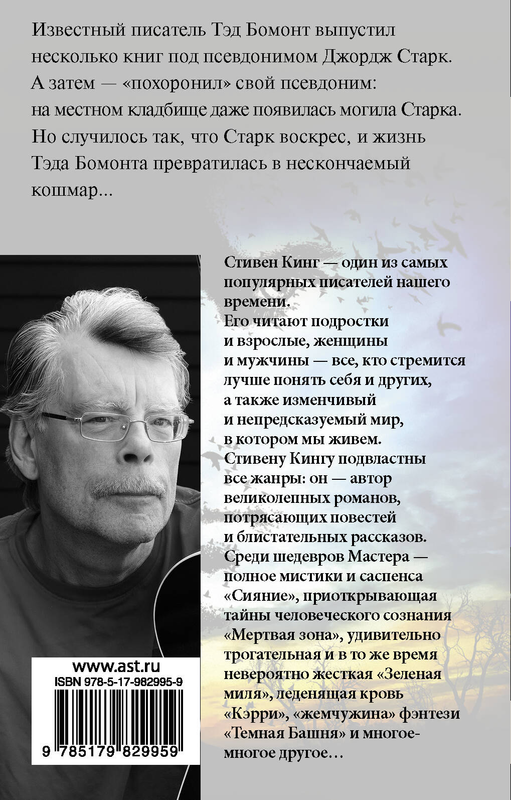 Известный писатель Тэд Бомонт выпустил несколько книг под псевдонимом Джордж Старк. А затем - "похоронил" свой псевдоним: на местном кладбище даже появилась могила Старка. Но случилось так, что Старк воскрес, и жизнь Тэда Бомонта превратилась в нескончаемый кошмар…| Издательство | ИЗДАТЕЛЬСТВО "АСТ" |
