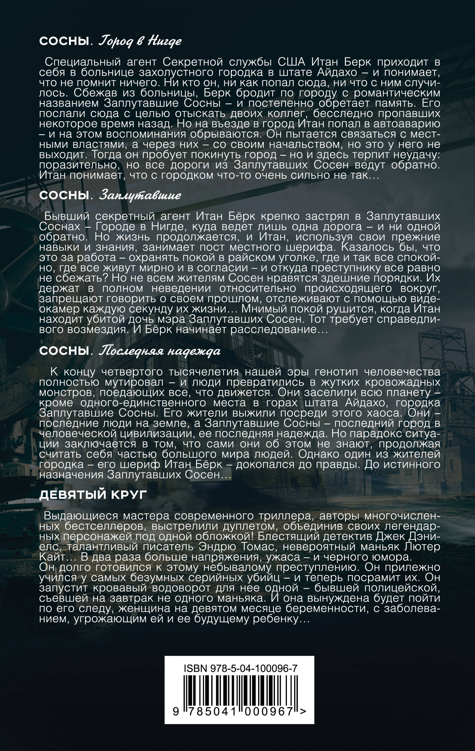 Сосны. Город в Нигде Специальный агент Секретной службы США Итан Берк приходит в себя в больнице захолустного городка в штате Айдахо - и понимает, что не помнит ничего. Ни кто он, ни как попал сюда, ни что с ним случилось. Сбежав из больницы, Берк бродит по городу с романтическим названием Заплутавшие Сосны - и постепенно обретает память. Его послали сюда с целью отыскать двоих коллег, бесследно пропавших некоторое время назад. Но на въезде в город Итан попал в автоаварию - и на этом воспоминания обрываются. Он пытается связаться с местными властями, а через них - со своим начальством, но это у него не выходит. Тогда он пробует покинуть город - но и здесь терпит неудачу: поразительно, но все дороги из Заплутавших Сосен ведут обратно. Итан понимает, что с городком что-то очень сильно не так… Сосны. Заплутавшие Бывший секретный агент Итан Бёрк крепко застрял в Заплутавших Соснах - Городе в Нигде, куда ведет лишь одна дорога - и ни одной обратно. Но жизнь продолжается, и Итан, используя свои прежние навыки и знания, занимает пост местного шерифа. Казалось бы, что это за работа - охранять покой в райском уголке, где и так все спокойно, где все живут мирно и в согласии - и откуда преступнику все равно не сбежать? Но не всем жителям Сосен нравятся здешние порядки. Их держат в полном неведении относительно происходящего вокруг, запрещают говорить о своем прошлом, отслеживают с помощью видеокамер каждую секунду их жизни… Мнимый покой рушится, когда Итан находит убитой дочь мэра Заплутавших Сосен. Тот требует справедливого возмездия. И Бёрк начинает расследование… Сосны. Последняя надежда К концу четвертого тысячелетия нашей эры генотип человечества полностью мутировал - и люди превратились в жутких кровожадных монстров, поедающих все, что движется. Они заселили всю планету - кроме одного-единственного места в горах штата Айдахо, городка Заплутавшие Сосны. Его жители выжили посреди этого хаоса. Они - последние люди на земле, а Заплутавшие Сосны - последний город в человеческой цивилизации, ее последняя надежда. Но парадокс ситуации заключается в том, что сами они об этом не знают, продолжая считать себя частью большого мира людей. Однако один из жителей городка - его шериф Итан Бёрк - докопался до правды. До истинного назначения Заплутавших Сосен… Девятый круг Выдающиеся мастера современного триллера, авторы многочисленных бестселлеров, выстрелили дуплетом, объединив своих легендарных персонажей под одной обложкой! Блестящий детектив Джек Дэниелс, талантливый писатель Эндрю Томас, невероятный маньяк Лютер Кайт… В два раза больше напряжения, ужаса - и черного юмора. Он долго готовился к этому небывалому преступлению. Он прилежно учился у самых безумных серийных убийц - и теперь посрамит их. Он запустит кровавый водоворот для нее одной - бывшей полицейской, съевшей на завтрак не одного маньяка. И она вынуждена будет пойти по его следу, женщина на девятом месяце беременности, с заболеванием, угрожающим ей и ее будущему ребенку…| Издательство | ООО "Издательство "Эксмо" |