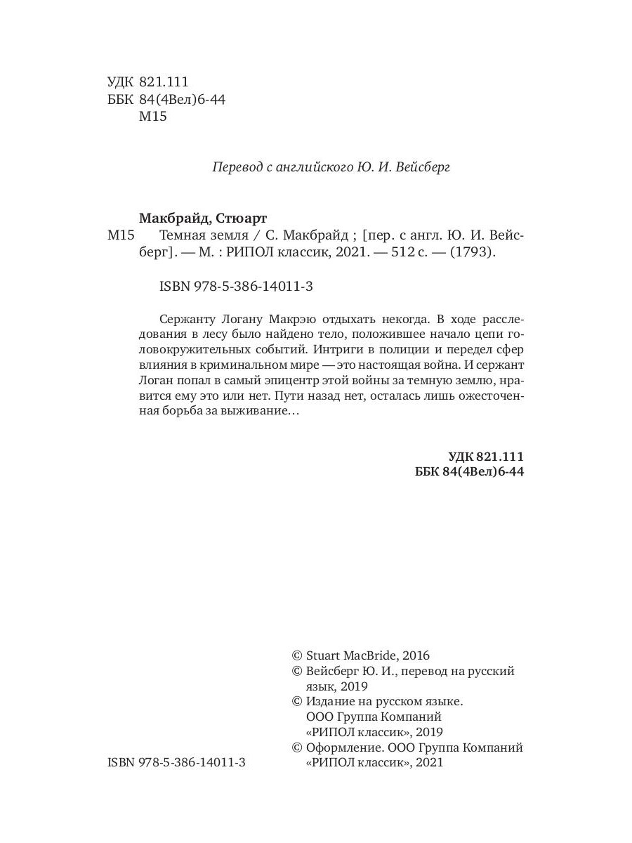 Сержанту Логану Макрэю отдыхать некогда. В ходе расследования в лесу было найдено тело, положившее начало цепи головокружительных событий. Интриги в полиции и передел сфер влияния в криминальном мире - это настоящая война. И сержант Логан попал в самый эпицентр этой войны за темную землю, нравится ему это или нет. Пути назад нет, осталась лишь ожесточенная борьба за выживание...| Издательство | Рипол Классик |