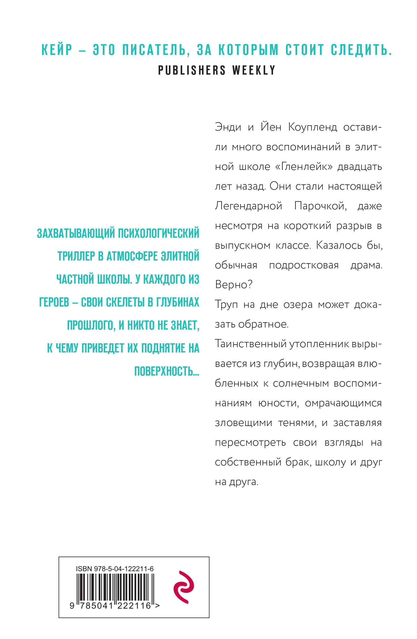 Захватывающий психологический триллер с атмосферой элитной частной школы, неуловимо схожий с нашумевшей книгой Донны Тарт «Тайная история». Энди и Йен Коупленд оставили много воспоминаний в элитной школе «Гленлейк» двадцать лет назад. Они стали настоящей Легендарной Парочкой, даже несмотря на короткий разрыв в выпускном классе. Казалось бы, обычная подростковая драма. Верно? Труп на дне озера может доказать обратное. Таинственный утопленник вырывается из глубин, возвращая влюбленных к солнечным воспоминаниям юности, омрачающихся зловещими тенями, и заставляя пересмотреть свои взгляды на собственный брак, школу и друг на друга. -------------------------------------------------- «Кейр - это писатель, за которым стоит следить». - Publishers Weekly «Это одновременно и увлекательное чтение, и своего рода исследование роли авторитета в атмосфере легендарной частной школы. Вы обнаружите, что стремитесь быстрее добраться до финала, а потом - что его послевкусие остается с вами надолго после прочтения последней страницы». - Меган Эбботт «Зловещий, изощренный и элегантно структурированный триллер. Мина, начиненная неопределенностью, давними секретами, скрытыми историями и манипуляциями. Когда у каждого есть секрет, сможет ли пережить их наличие идеальная семья? Какая захватывающая и оригинальная история! У меня не получалось остановиться». - Хенк Филиппи Райан «Умная, захватывающая загадка, в которой исследуется, как секреты прошлого могут сплотить семью - или навсегда разлучить ее». - Лу Берни «Тело на дне озера. Семейная пара, у которой есть секреты со времен школы-интерната. И их находчивая дочь, способная раскрыть правду, которую она не хочет знать. Захватывающая тайна убийства, изобилующая поэзией, страстью и ложью, захватила меня до самого конца. Роскошная, мрачная сказка, от которой я не могла оторваться!» - Эмили Карпентер «Искусное повествование Линды Кейр о частной школе, разрушенной многолетним скандалом, - соблазнительная история с напряженным ожиданием. Ложь, которую мы произносим, не только определяет нас. Она становится нами». - Эмбер Коуи «Хорошо написанная история, которая не отпускает». - Booklist| Издательство | Эксмо |