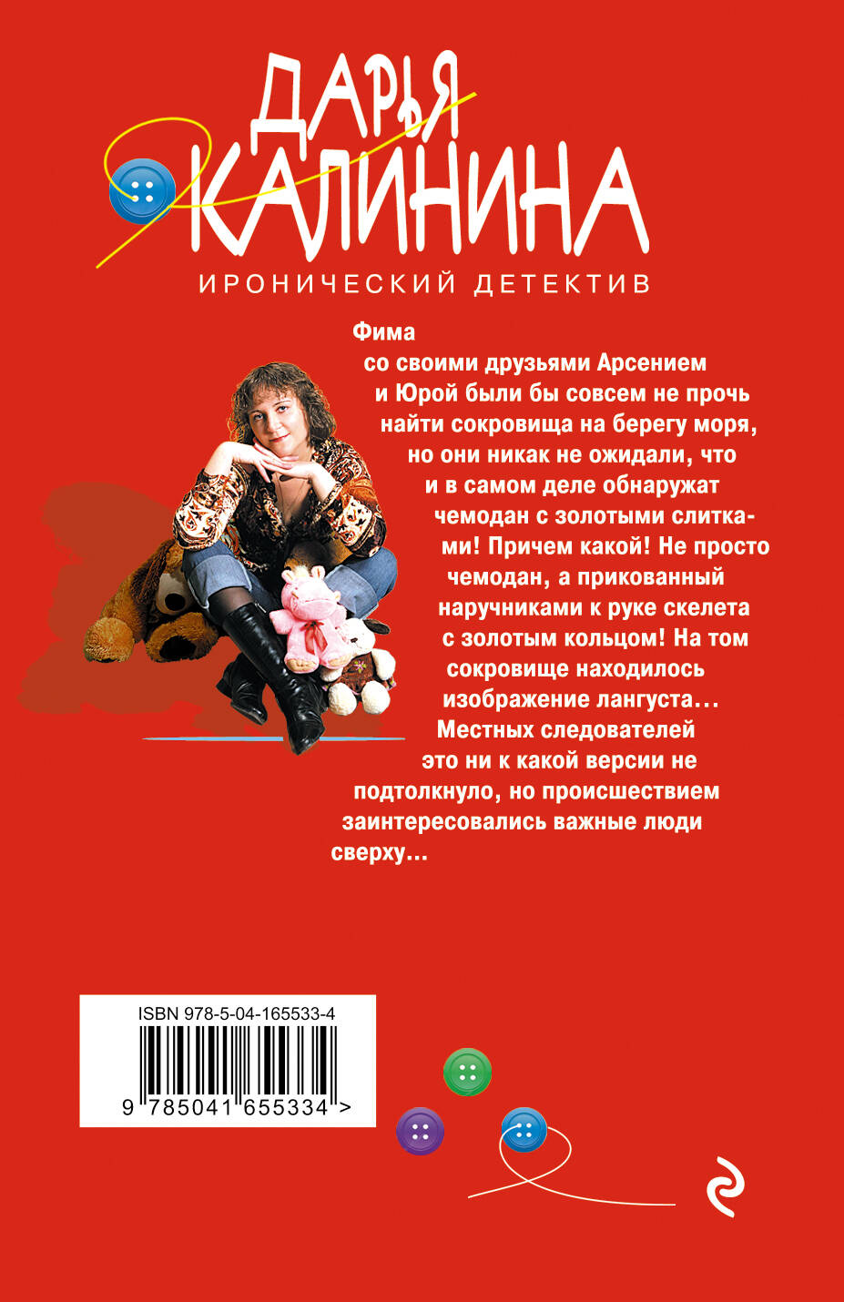 Фима и ее друзья Арсений и Юра были бы совсем не прочь найти сокровища на берегу моря. Но они никак не ожидали, что и в самом деле обнаружат чемодан с золотыми слитками, да еще какой: прикованный наручниками к руке скелета с золотым кольцом! А еще на нем красовалось странное изображение лангуста. Местных следователей это ни к какой версии не подтолкнуло, но происшествием заинтересовались важные люди наверху… Удастся ли Фиме продолжить свой отдых на берегу моря, что скрывает откопанный клад и кто во всем этом замешан - обо всем этом читайте в новом ироническом детективе Дарьи Калининой.| Издательство | Эксмо |