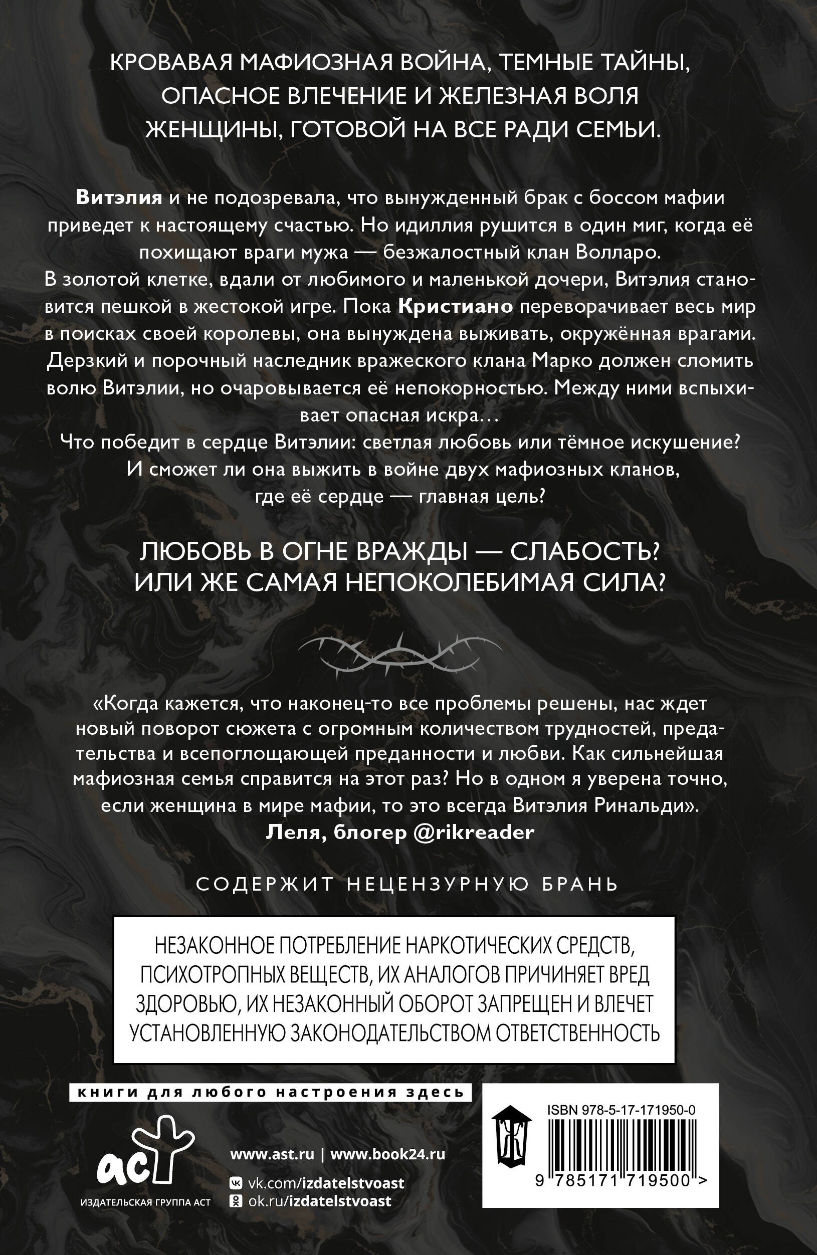 - Дерзкая, откровенная и захватывающая темная романтика для поклонников «Хроник мафии» Коры Рейли. Вторая книга дилогии. - «Разрушенный мир. Пылающая война. И любовь, выживающая среди пепла. Эта история не отпустит вас до последней страницы. Вы будете плакать, смеяться, ненавидеть... И до самого конца верить, что настоящая любовь способна пережить любые испытания» - Поли Эйр, автор мафиозных романов. - Тематическое оформление: стильный покет с клапанами, увеличенный формат, продуманная верстка и черно-белые иллюстрации. - Серия «Мафия. Любовь на краю пропасти». Также читайте: «Гордые души» - Ана Рома и «Танец крылатых теней» - Поли Эйр.| Издательство | Издательство "АСТ" |