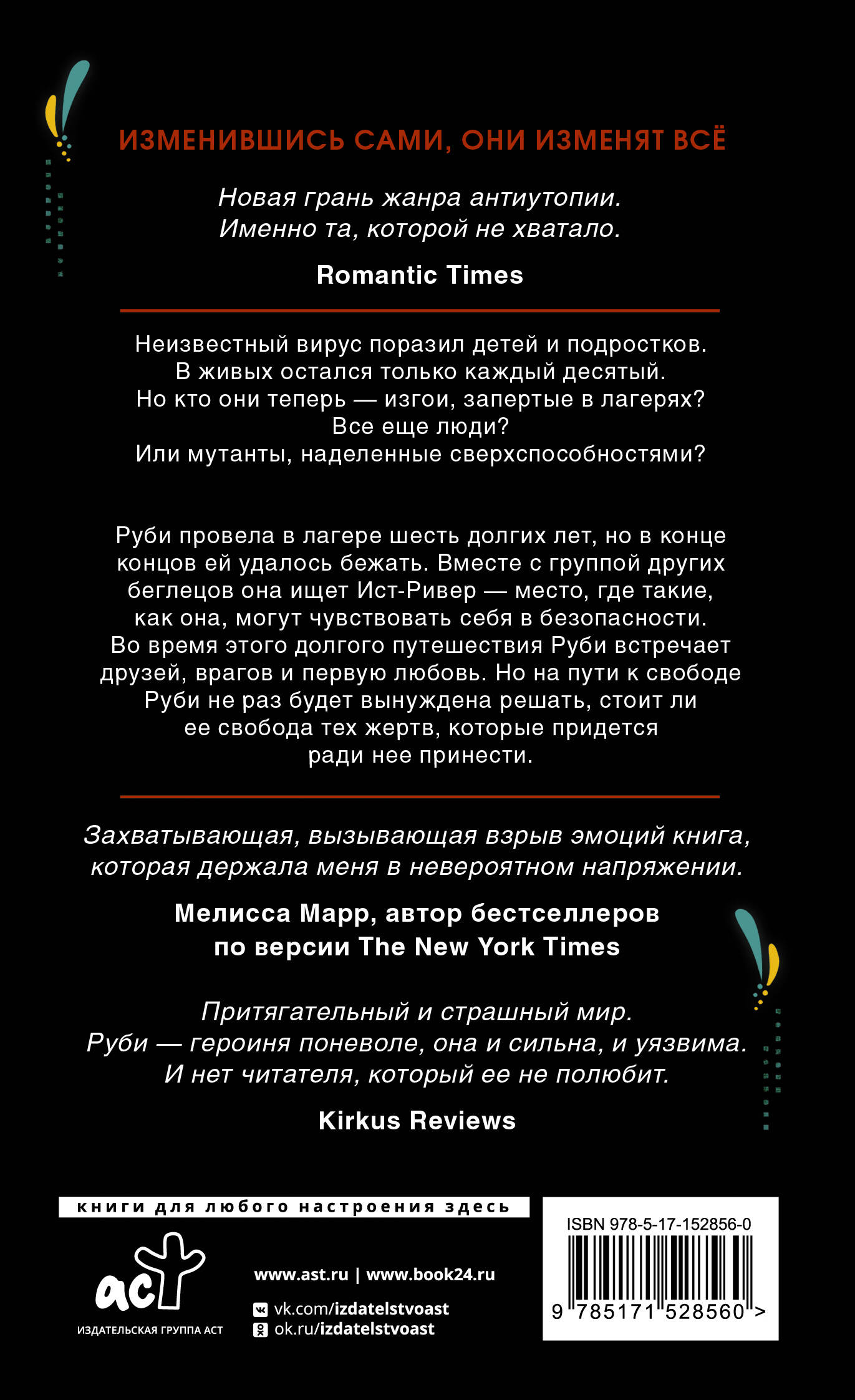 Неизвестная болезнь унесла жизни более 90% детей в стране. Выжившие обрели странные, пугающие способности. Всех их теперь содержат в концлагерях, лишив свободы, привычной жизни и индивидуальности. Руби провела в лагере шесть долгих лет, но в конце концов ей удалось бежать. Присоединившись к группе других беглецов, она ищет Ист-Ривер - место, где такие, как она, могут чувствовать себя в безопасности. Во время этого долгого путешествия Руби не раз придется решать - стоит ли свобода тех жертв, которые придется ради нее принести.| Издательство | ИЗДАТЕЛЬСТВО "АСТ" |
