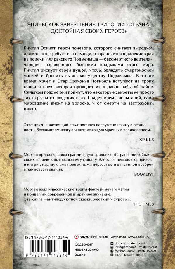 Рингил Эскиат, герой поневоле, которого считают выродком даже те, кто требует его помощи, отправляется в далекие края на поиски Иллракского Подменыша - бессмертного воителя-чародея, взращенного бывшими владыками этого мира. Рингил рискует своей душой, чтобы овладеть смертоносной магией и бросить вызов могуществу Подменыша. В то же время Арчет и Эгар Драконья Погибель вступают на тропу крови и слез, которая приведет их к давно забытой тайне. Слишком поздно они поймут, что некоторые секреты не просто так скрыты от людских глаз. Грядет время испытаний, само мироздание висит на волоске, и от смерти не застрахован никто.