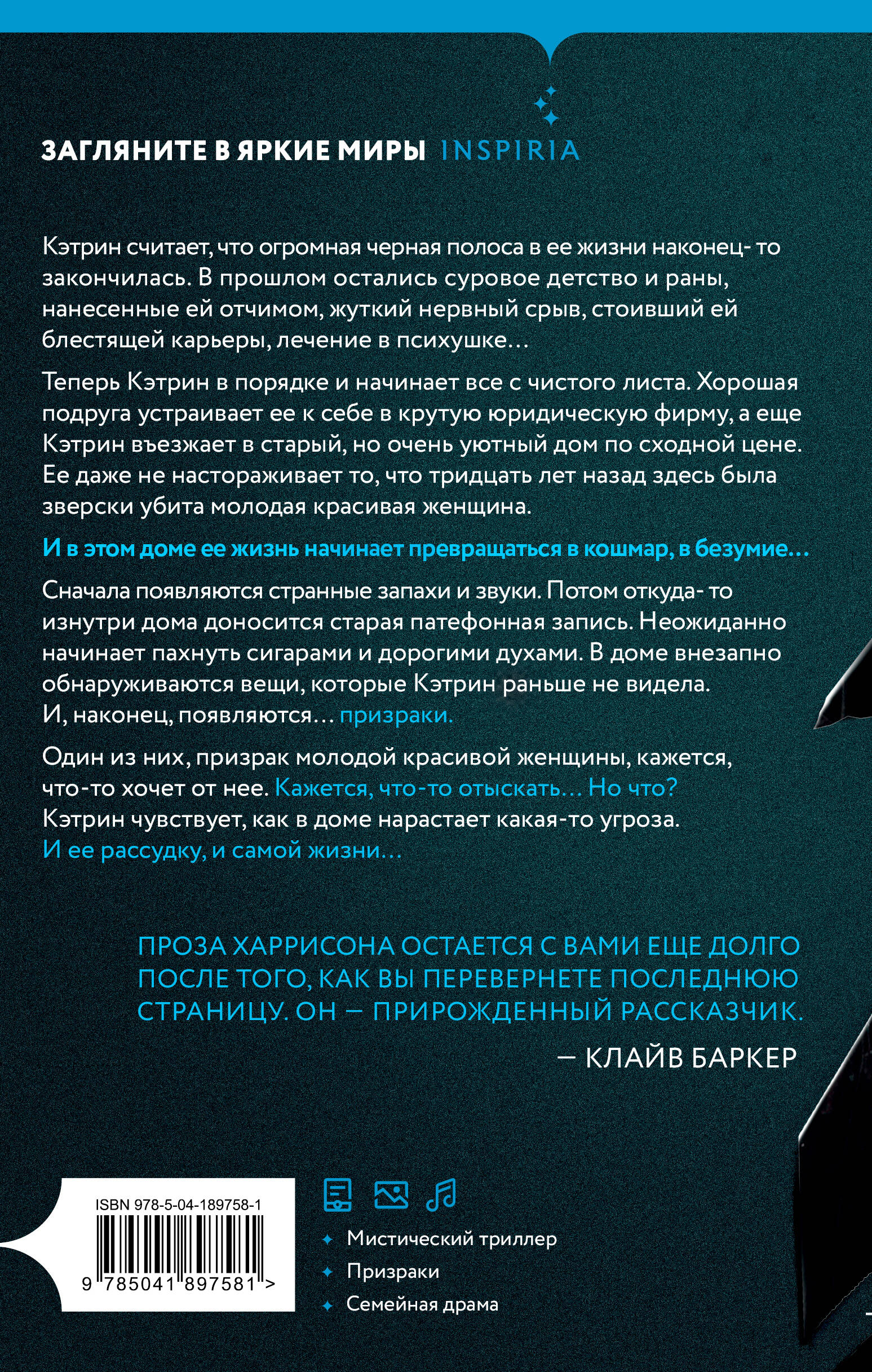 Искусно закрученный мистический роман в лучших традициях жанра: старый дом, скрытые комнаты, старые тайны - и призраки. История, напоминающая «Сияние» Стивена Кинга, ведет вас по лабиринтам загадок к неожиданной развязке. И всю дорогу у вас будет стынуть в жилах кровь… Если видишь призрака, это еще не значит, что ты сошла с ума… Кэтрин считает, что огромная черная полоса в ее жизни наконец-то закончилась. В прошлом осталось суровое детство и раны, нанесенные ей отчимом, жуткий нервный срыв, стоивший ей блестящей карьеры, лечение в психушке… Теперь Кэтрин в порядке и начинает все с чистого листа. Старая подруга устраивает ее к себе в крутую юридическую фирму, а еще Кэтрин въезжает в старый, но очень уютный дом по сходной цене. Ее даже не настораживает то, что тридцать лет назад здесь была зверски убита молодая красивая женщина. И в этом доме ее жизнь начинает превращаться в кошмар, в безумие… Сначала появляются странные запахи и звуки. Потом откуда-то изнутри дома доносится старая патефонная запись. Неожиданно начинает пахнуть сигарами и дорогими духами. В доме внезапно обнаруживаются вещи, которые Кэтрин раньше не видела. И, наконец, появляются… призраки. Один из них, призрак молодой красивой женщины, кажется, что-то хочет от нее. Кажется, что-то отыскать… Но что? Кэтрин чувствует, как в доме нарастает какая-то угроза. И ее рассудку, и самой жизни… ------------------------------------------------------------------------------------------------------------ «Проза Харрисона остается с вами еще долго после того, как вы перевернете последнюю страницу. Он - прирожденный рассказчик». - Клайв Баркер «История о привидениях, спрятанная в человеческую историю. В этой книге есть сцена, которая заставила меня подпрыгнуть. Роман изящный, но дерзкий, не дающий перевести дух… Сильные женщины, сильные мужчины, сталкивающиеся на фоне семейной истории и психического состояния главной героини. Джон Харрисон написал одну из моих любимых книг года». - Джош Малерман «Этот роман Джона Харрисона оставляет неизгладимый след в сознании читателя. Мрачный, тревожный и убедительный. Настоятельно рекомендуется, но не для слабонервных». - Джонатан Маберри «Жуткая саспенс-история с подлинным психологическим ужасом. Острый, как бритва, текст, наполненный деталями, которые останутся с вами надолго после того, как вы закончите читать». - Кевин Андерсон «Роман режиссера Джона Харрисона кинематографичен, как и следовало ожидать, но это и прекрасный образец литературного искусства, романтическая и тревожная смесь Дафны Дюморье и Ширли Джексон. Настоящее удовольствие для читателей». - Дэниел Крауз| Издательство | ООО "Издательство "Эксмо" |