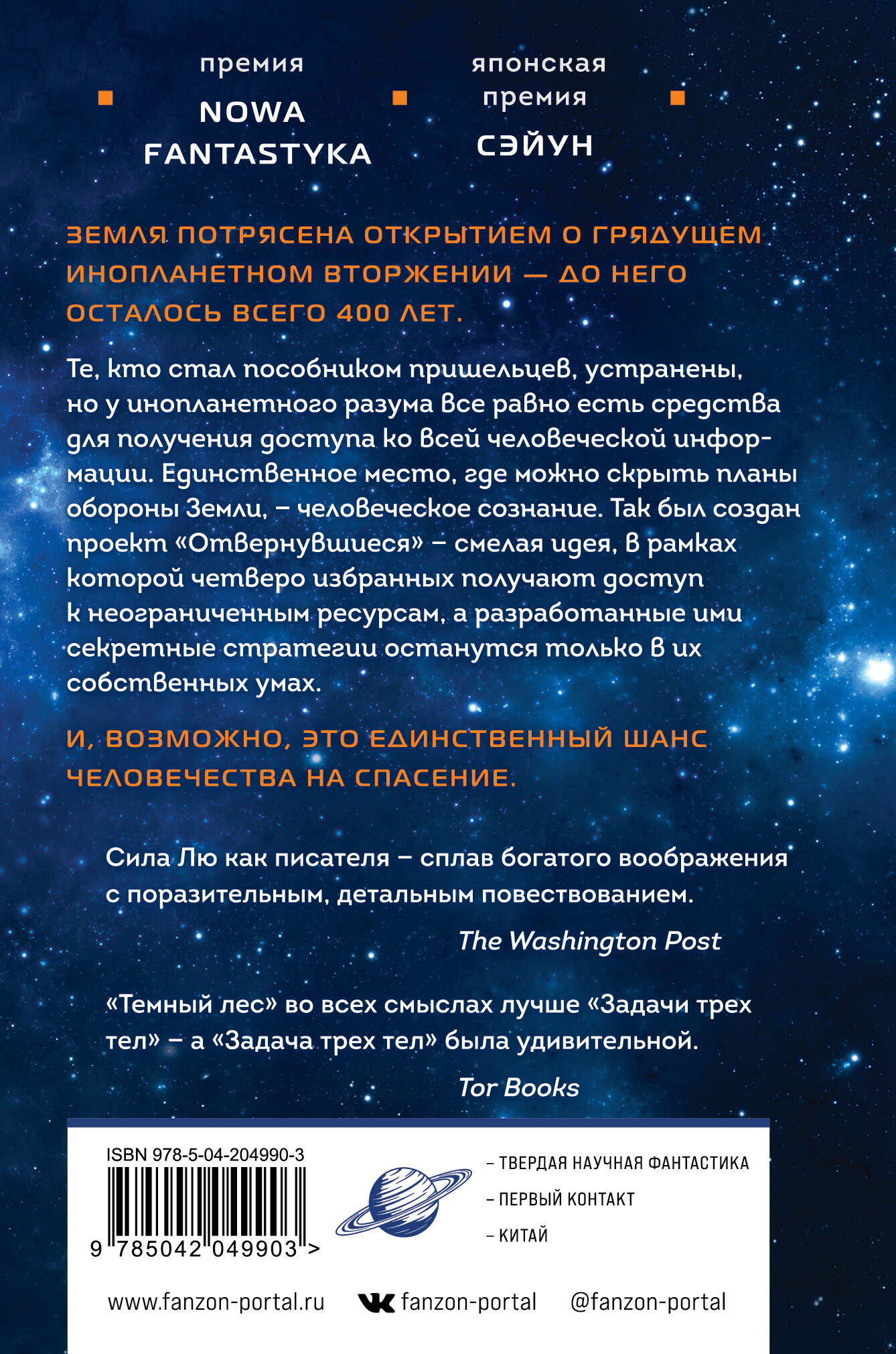 Продолжение феноменальной «Задачи трех тел», романа великого китайского фантаста Лю Цысиня. Лауреат премии журнала «Nowa Fantastyka», японская премия «Сэйун» («Туманность»). До прибытия сил инопланетного вторжения осталось 400 лет. Земные политические лидеры не хотят объединяться перед лицом общей угрозы, каждый преследует собственные цели. А эмиссары чужой цивилизации осуществляют тотальный контроль над всеми научно-техническими разработками и саботируют их, снижая шансы землян на победу практически до нуля. Есть лишь единственный шанс - проекты «Отвернувшихся». Четверо избранных, лучшие умы Земли, разработавшие план по отражению атаки пришельцев. Они хранят его в самом безопасном месте - собственном разуме, и от их действий зависит исход войны. По мотивам цикла вышел китайский сериал и скоро появится экранизация от Netflix! «Сила Лю как писателя - сплав богатого воображения с поразительным, детальным повествованием». - The Washington Post «"Темный лес" во всех смыслах лучше "Задачи трех тел", - а "Задача трех тел" была удивительной». - Tor Books «Книги Лю Цысиня будут интересны тем, кто хочет вспомнить научную фантастику старой школы, Айзека Азимова и Артура Кларка, или просто быть в курсе современных тенденций зарубежной фантастической литературы». - Geektimes| Издательство | ООО "Издательство "Эксмо" |