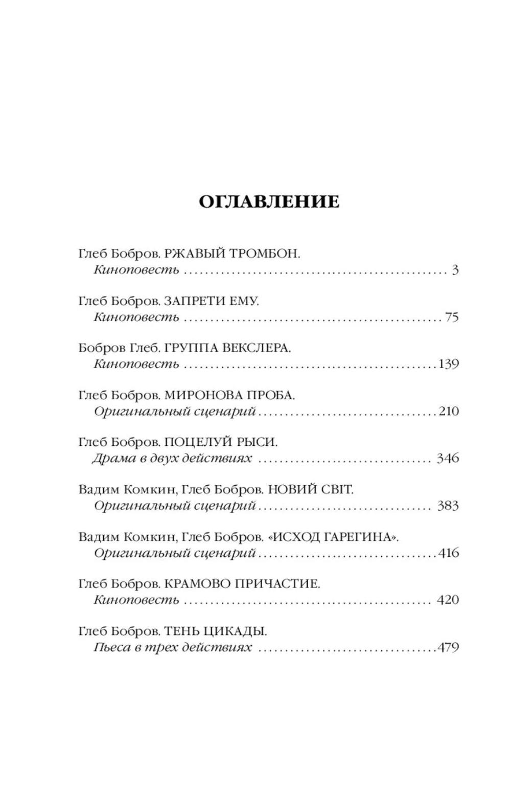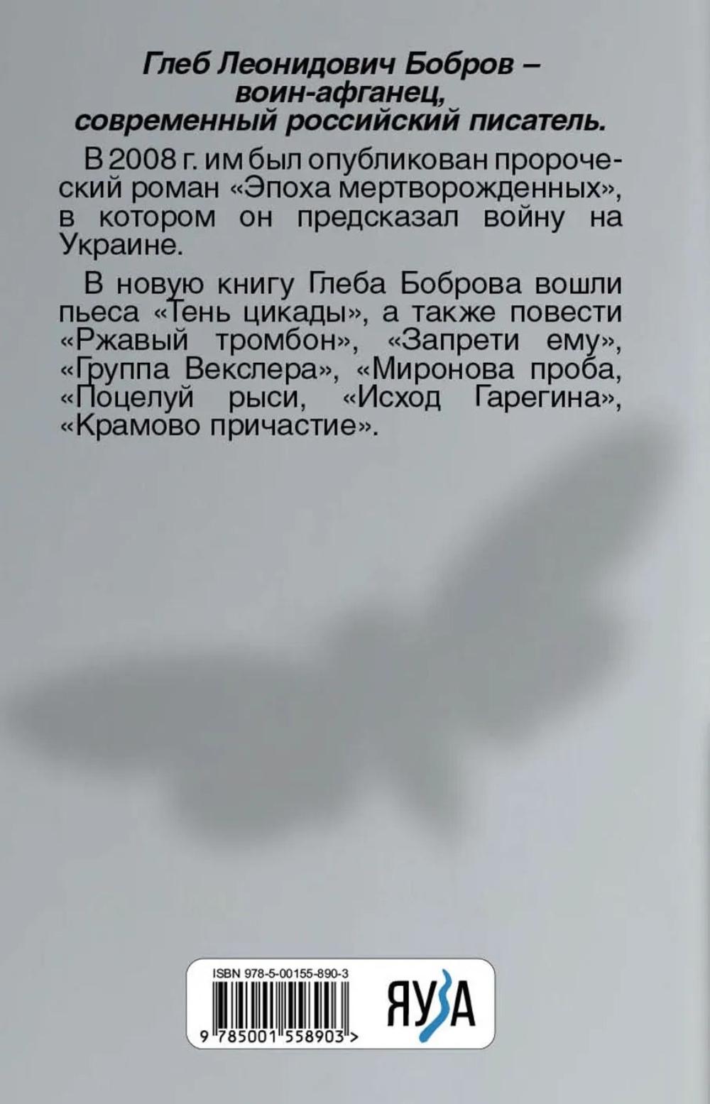 Глеб Леонидович Бобров - воин-афганец, современный российский писатель. В 2008 г. им был опубликован пророческий роман «Эпоха мертворожденных», в котором была предсказана война на Украине. В новую книгу Глеба Боброва вошли пьеса «Тень цикады», а также повести «Ржавый тромбон», «Запрети ему», «Группа Векслера», «Миронова проба, «Поцелуй рыси, «Исход Гарегина», «Крамово причастие».| Издательство | Яуза-каталог |
