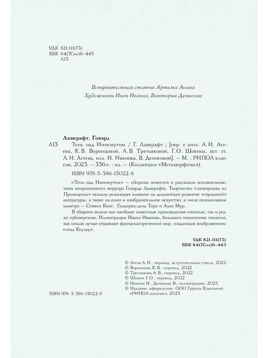 "Тень над Иннсмутом" - сборник повестей и рассказов основоположника американского хоррора Говарда Лавкрафта. Творчество "затворника из Провиденса" оказало решающее влияние на дальнейшее развитие "страшной" литературы, а также на кино и изобразительное искусство; в числе поклонников маэстро - Стивен Кинг, Гильермо дель Торо и Алан Мур. В сборник вошли как наиболее известные произведения писателя, так и редко публикуемые. Иллюстрации Ивана Иванова, большого поклонника писателя, как нельзя лучше отражают фантасмагорический мир, созданный воображением "отца Ктулху".| Издательство | Рипол Классик |