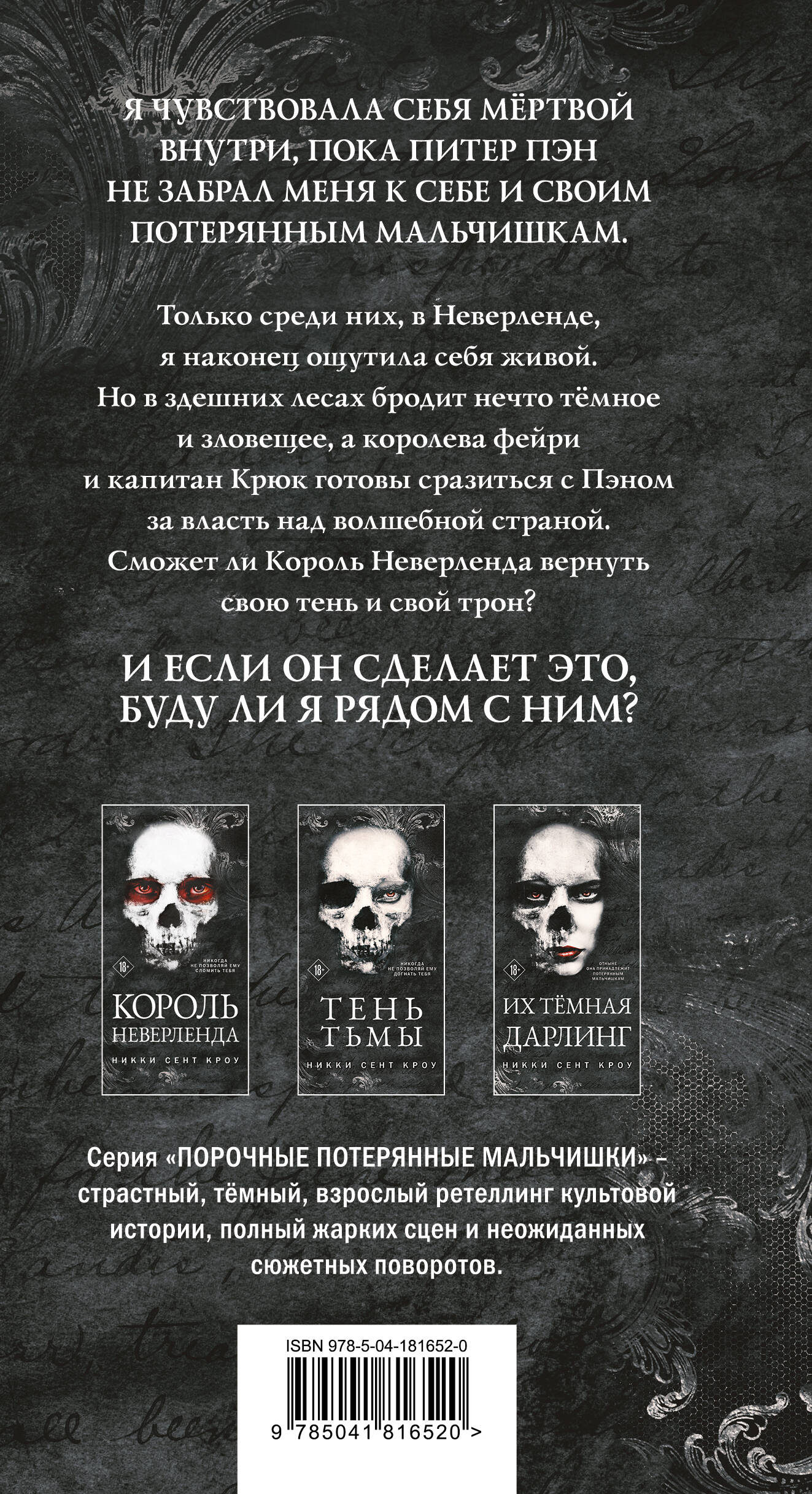 Я чувствовала себя мёртвой внутри, пока Питер Пэн не забрал меня к себе и своим Потерянным Мальчишкам. Только среди них, в Неверленде, я наконец ощутила себя живой. Но в здешних лесах бродит нечто тёмное и зловещее, а королева фейри и капитан Крюк готовы сразиться с Пэном за власть над волшебной страной. Сможет ли Король Неверленда вернуть свою тень и свой трон? И если он сделает это, буду ли я рядом с ним? Продолжение нашумевшей серии «Порочные Потерянные Мальчишки». Страстный, тёмный, взрослый ретеллинг культовой истории о Питере Пэне, полный жарких сцен и неожиданных сюжетных поворотов. Высочайшие рейтинги на Amazon: неизменный бестселлер вот уже больше года! Внутренние иллюстрации популярного художника ALES (больше 50 000 подписчиков в ВК). Уникальная обложка, которая светится в темноте. Целая россыпь харизматичных мужчин, невероятные эмоции, поцелуи, ссоры и чувственность в каждом прикосновении.| Издательство | ООО "Издательство "Эксмо" |