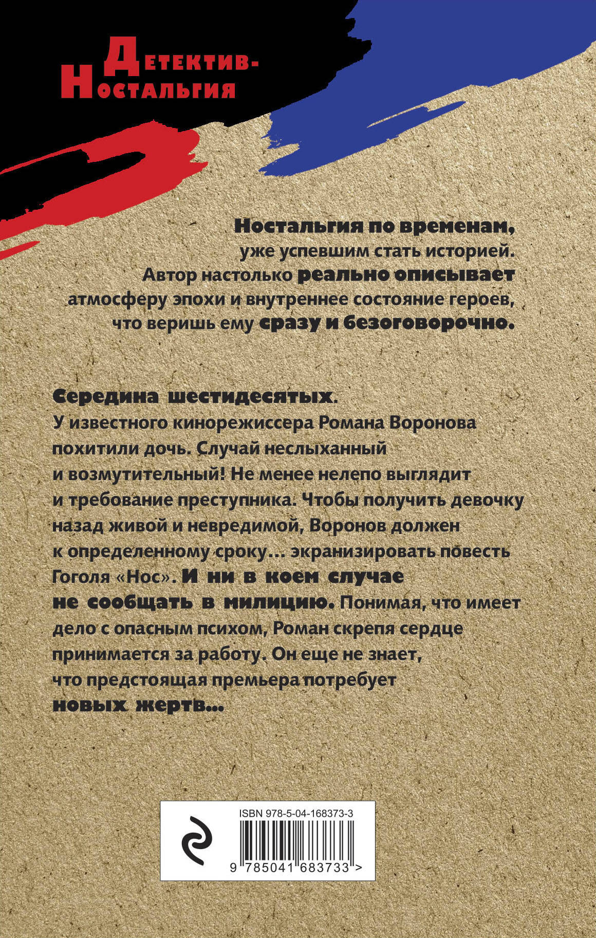 Ностальгия по временам, уже успевшим стать историей. Автор настолько реально описывает атмосферу эпохи и внутреннее состояние героев, что веришь ему сразу и безоговорочно. Середина шестидесятых. У известного кинорежиссера Романа Воронова похитили дочь. Случай неслыханный и возмутительный! Не менее нелепо выглядит и требование преступника. Чтобы получить девочку назад живой и невредимой, Воронов должен к определенному сроку… экранизировать повесть Гоголя «Нос». И - ни в коем случае не сообщать в милицию. Понимая, что имеет дело с опасным психом, Роман скрепя сердце принимается за работу. Он еще не знает, что предстоящая премьера потребует новых жертв… Уникальная возможность на время вернуться в недавнее прошлое и в ощущении полной реальности прожить вместе с героями самый отчаянный отрезок их жизни.| Издательство | ООО "Издательство "Эксмо" |