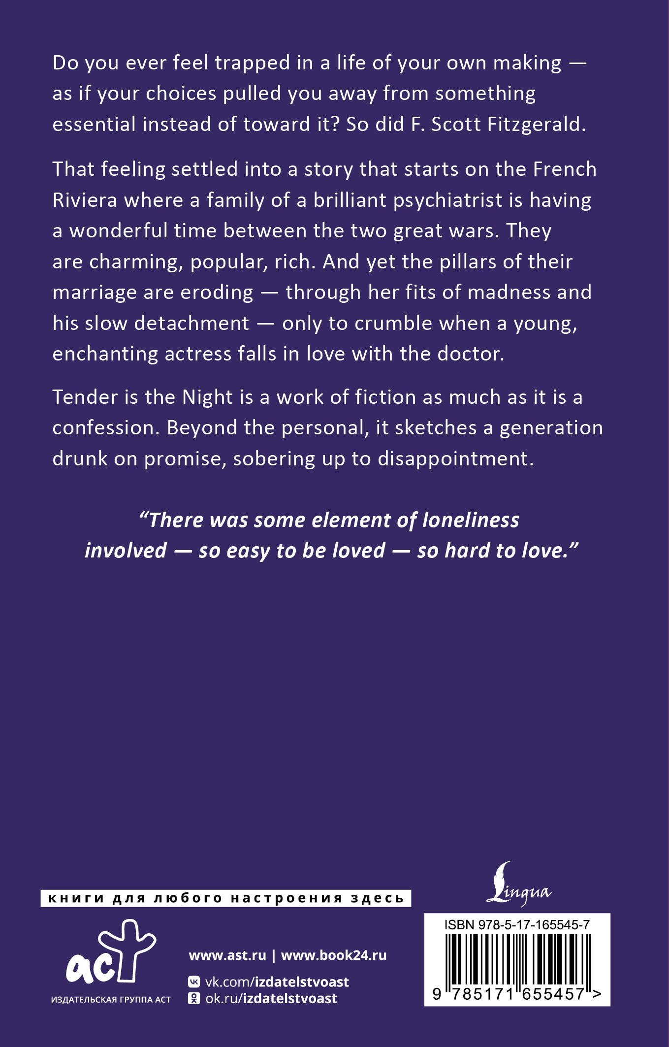 Эта история берет начало в ревущие двадцатые на французской Ривьере, где отдыхает семья талантливого доктора-психиатра из Америки. Они любимы, обаятельны, богаты - и счастливы. Так, во всяком случае, думает юная актриса, влюбленная в доктора, пока не слышит нечеловеческий вой, доносящийся из ванной. А доктор, женившийся на пациентке, думает о том, что с каждым "правильным" шагом он становится все дальше от чего-то бесконечно важного. "Ночь нежна" - это не только роман, но и исповедь Фрэнсиса Скотта Фицджеральда. Это книга о поколении, которому пообещали слишком много, и о любви, которая не спасает.| Издательство | Издательство "АСТ" |
