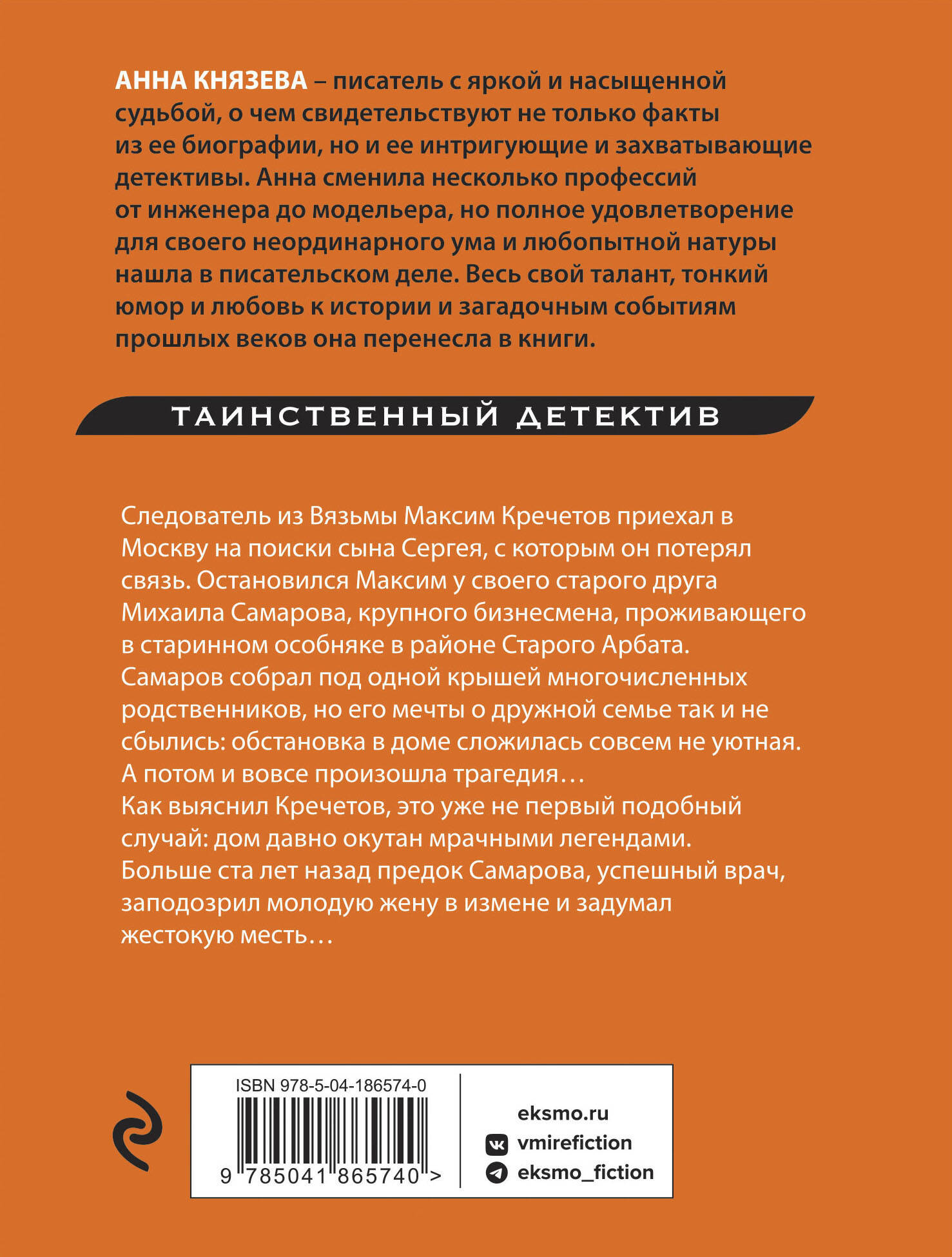 Следователь из Вязьмы Максим Кречетов приехал в Москву на поиски сына Сергея, с которым он потерял связь. Остановился Максим у своего старого друга Михаила Самарова, крупного бизнесмена, проживающего в старинном особняке в районе Старого Арбата. Самаров собрал под одной крышей многочисленных родственников, но его мечты о дружной семье так и не сбылись: обстановка в доме сложилась совсем не уютная. А потом и вовсе произошла трагедия… Как выяснил Кречетов, это уже не первый подобный случай: дом давно окутан мрачными легендами. Больше ста лет назад предок Самарова, успешный врач, заподозрил молодую жену в измене и задумал жестокую месть… Анна Князева - автор, которого любят тысячи. Ее остросюжетные романы не оставляют равнодушной ни одного читателя. Живой темперамент, жизнелюбие и разносторонние интересы позволяют Анне Князевой писать романы с динамичным сюжетом, который захватывает читателя с первой же страницы.