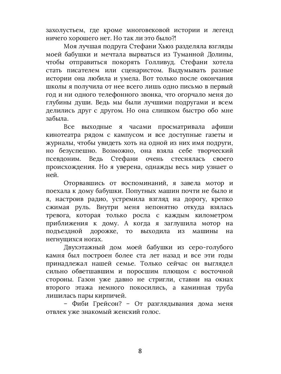 В пригороде старого города Салем, есть Туманная Долина - местечко, где в густом лесу, окутанном плотным туманом, испокон веков пропадают люди, а по лесу бродят призрачные тени с горящими глазами. Ходить в одиночку в туманный лес всегда было опасно, особенно после захода солнца. Пять лет назад Фиби удалось вырваться из этого жуткого города, потеряв всех своих друзей, но трагические события возвращают ее в родные края, где ей предстоит столкнуться со всем этим вновь. Теперь девушке придется разобраться не только в событиях пятилетней давности и в загадках далекого прошлого, но и в своих чувствах.| Издательство | Т8 RUGRAM |