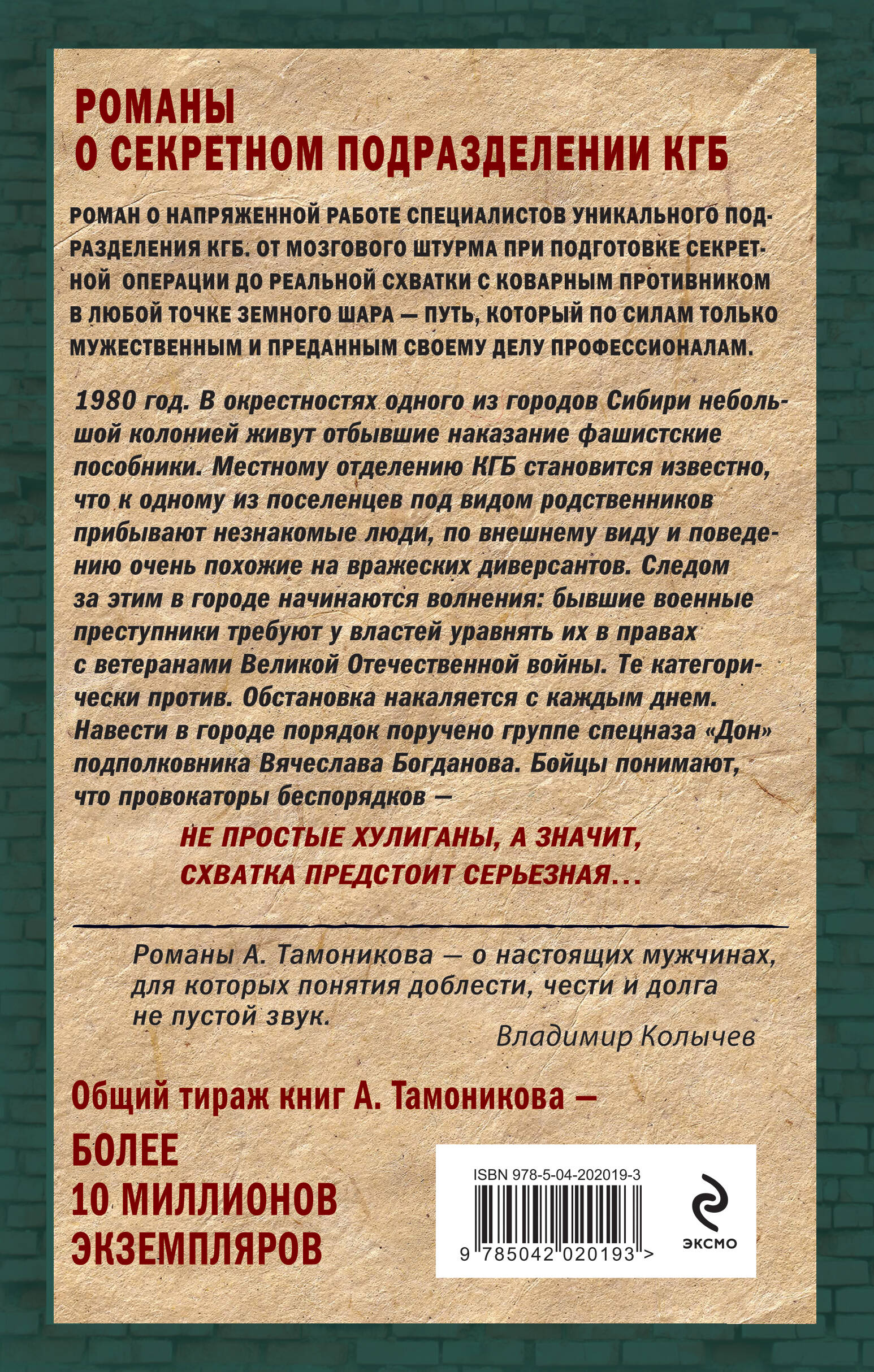 Роман о напряженной работе специалистов уникального подразделения КГБ. От мозгового штурма при подготовке секретной операции до реальной схватки с коварным противником в любой точке земного шара - путь, который по силам только мужественным и преданным своему делу профессионалам. 1980 год. В окрестностях одного из городов Сибири небольшой колонией живут отбывшие наказание фашистские пособники. Местному отделению КГБ становится известно, что к одному из поселенцев под видом родственников прибывают незнакомые люди, по внешнему виду и поведению очень похожие на вражеских диверсантов. Следом за этим в городе начинаются волнения: бывшие военные преступники требуют у властей уравнять их в правах с ветеранами Великой Отечественной войны. Те категорически против. Обстановка накаляется с каждым днем. Навести в городе порядок поручено группе спецназа «Дон» подполковника Вячеслава Богданова. Бойцы понимают, что провокаторы беспорядков - не простые хулиганы, а, значит, схватка предстоит серьезная… «Романы А. Тамоникова - о настоящих мужчинах, для которых понятия доблести, чести и долга - не пустой звук». - В. Колычев Общий тираж книг А. Тамоникова - более 10 миллионов экземпляров.| Издательство | ООО "Издательство "Эксмо" |