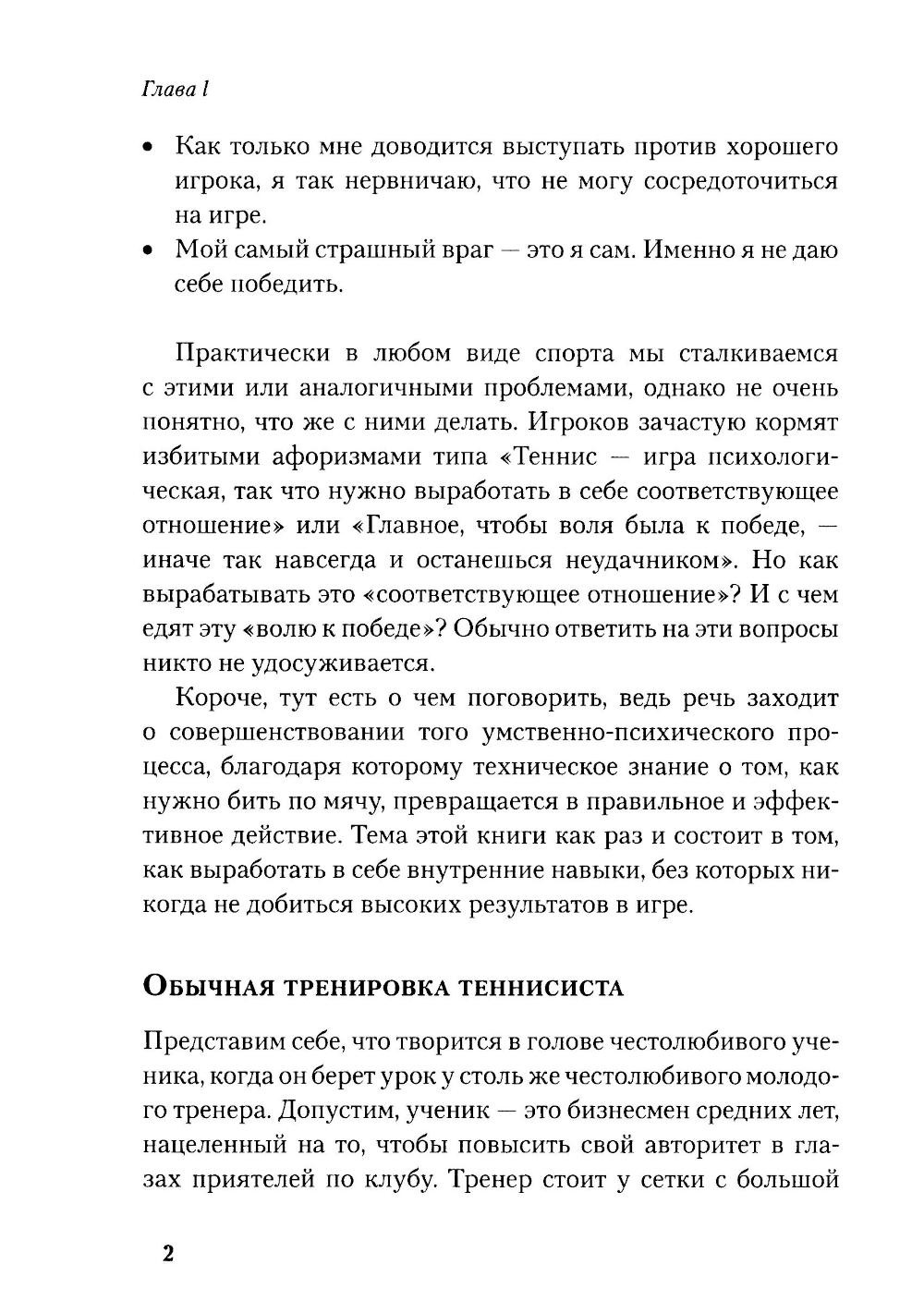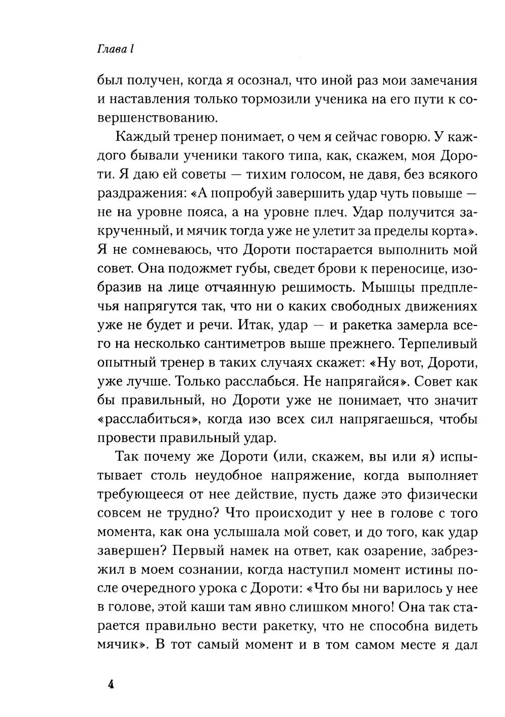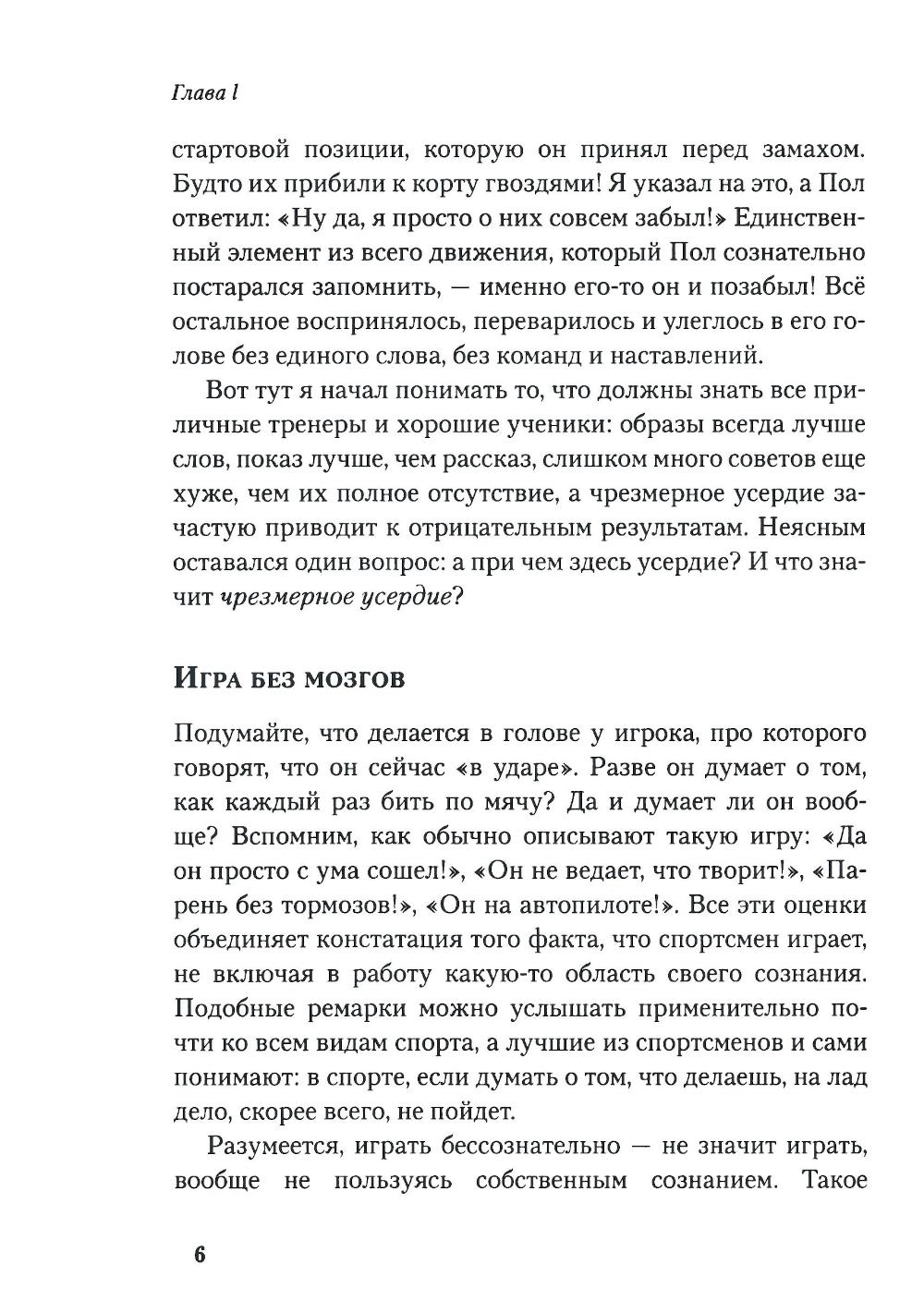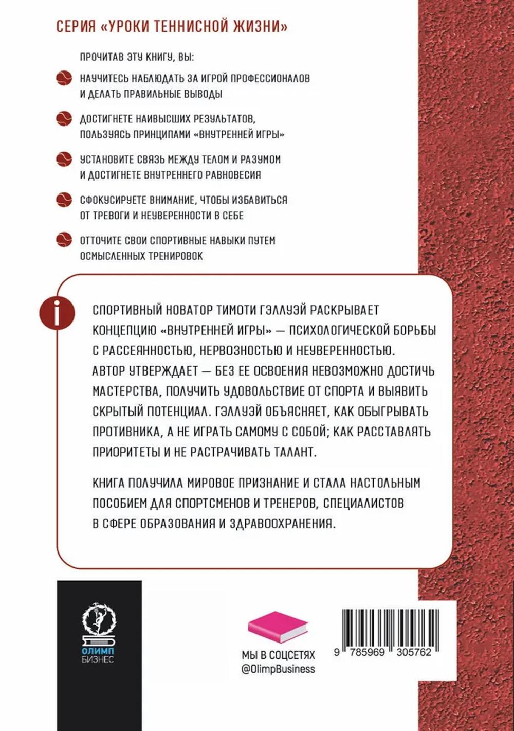 Любая игра состоит из двух элементов - «внешней игры» и «внутренней игры». «Внешнюю игру» ведут с внешним противником, в ходе ее преодолевают внешние препятствия и достигают определенных внешних целей. «Внутренняя игра» происходит в сознании игрока, в ней преодолевают такие препятствия, как неспособность сосредоточиться, нервозность, неуверенность в себе и самоосуждение. Тимоти У. Гэллуэй утверждает: вы не добьетесь ни в какой игре ни совершенства, ни радости, если не обратите должного внимания на неприметные хитрости «внутренней игры», цель которой - раскрытие и реализация потенциала, кроющегося внутри вашего тела. В этой книге он рассказывает о возможностях «внутренней игры» на примере игры в теннис.| Издательство | Олимп-Бизнес |